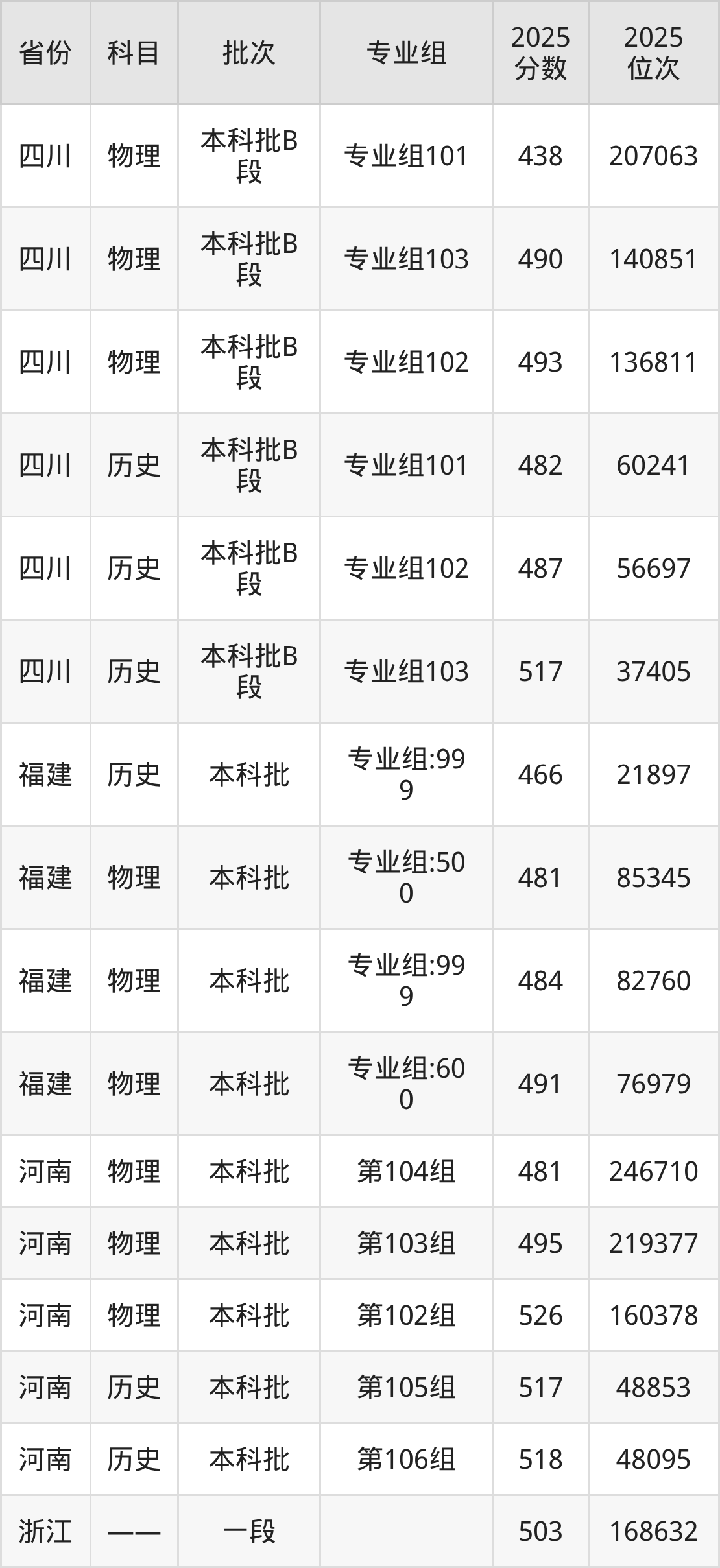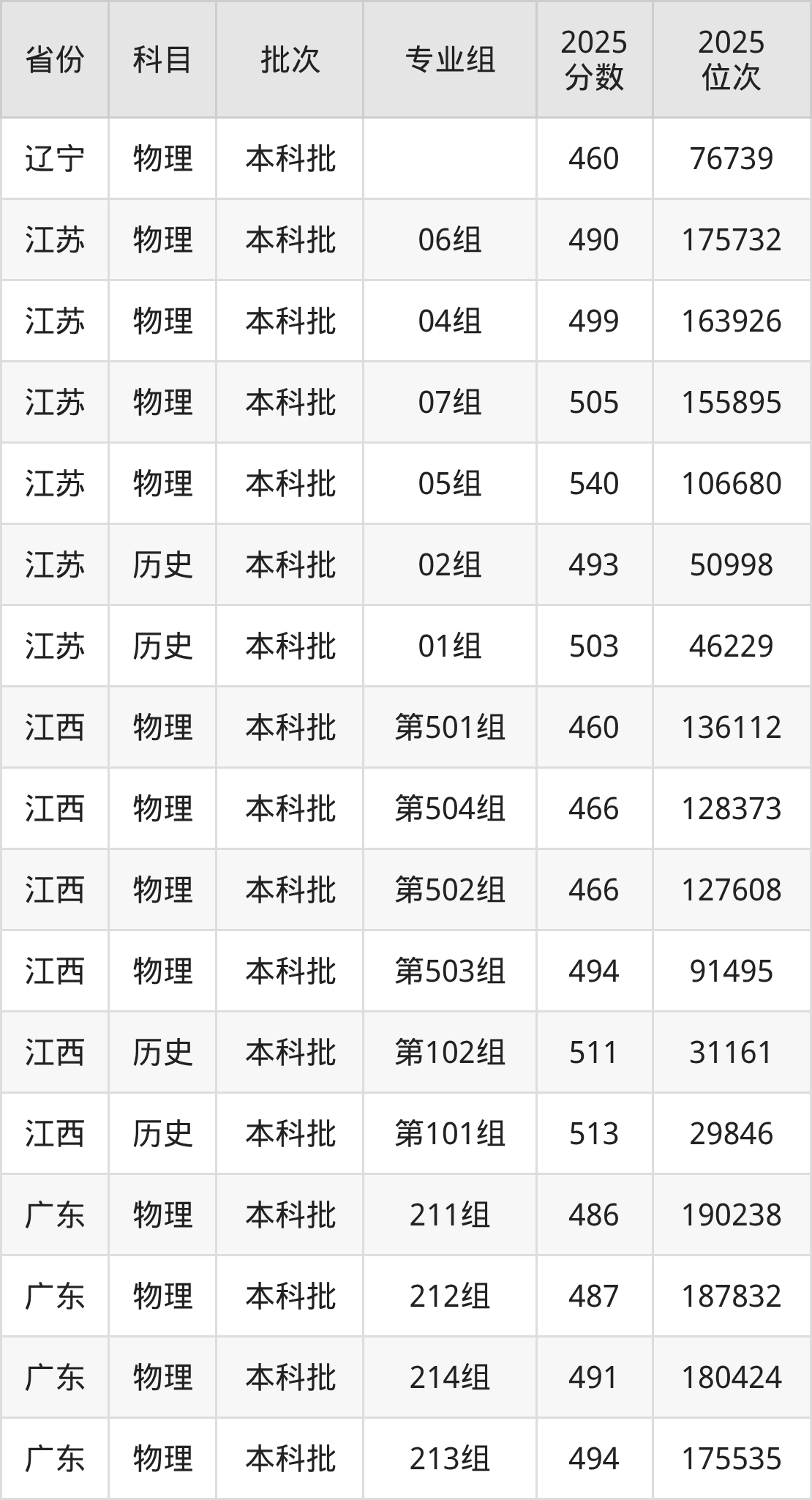 2025年在本科物理类进行招生,各专业组分数线详情如下: