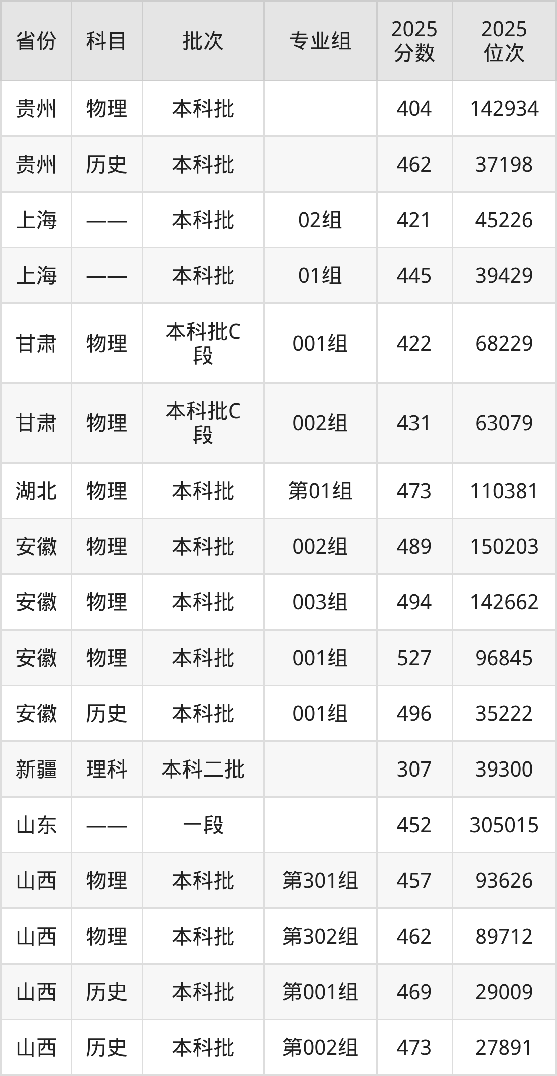2025年投档录取最低分为404分,录取最低位次为142934名。