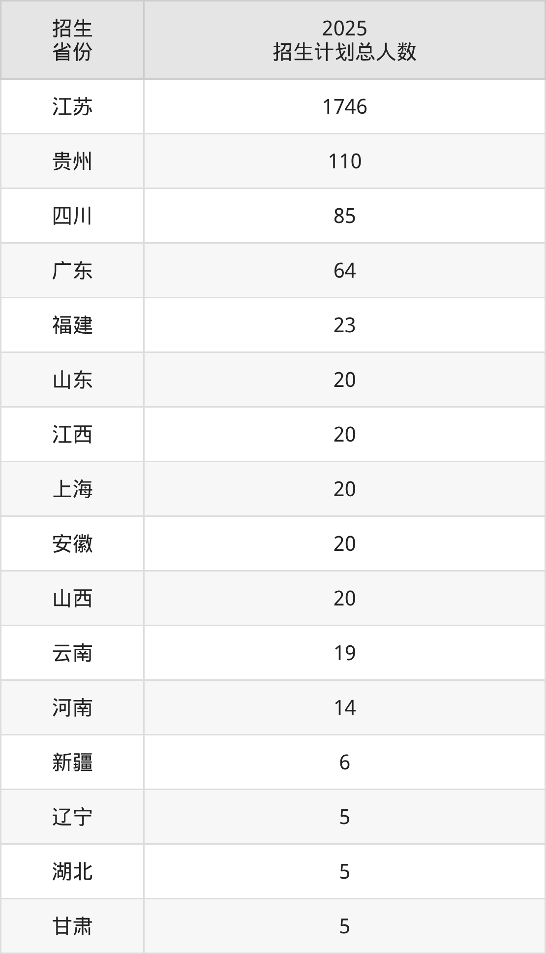 2025年南京医科大学康达学院面向全国16个省市开展本科招生;招生专业共15个,招生人数共2182人。2025年在江苏省招生计划总人数是1746人,其中,南京医科大学康达学院在江苏省招生人数最多的是护理学。南京医科大学康达学院在各省具体招生人数情况如下表。