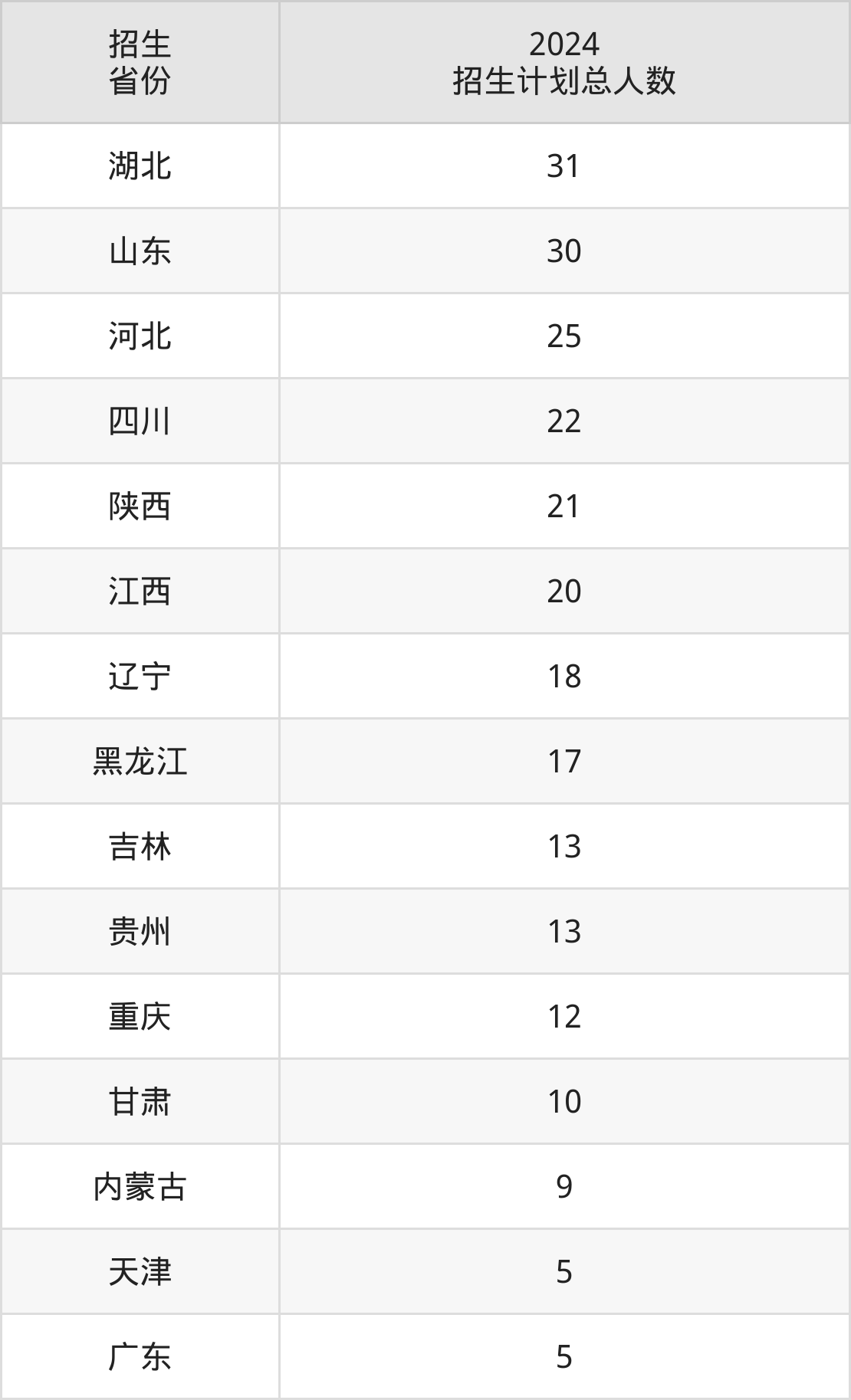 2024年空军预警学院面向全国15个省市开展本科招生;招生专业共7个,招生人数共251人。2024年在湖北省招生计划总人数是31人,其中,空军预警学院在湖北省招生人数最多的是预警探测。空军预警学院在各省具体招生人数情况如下表。
