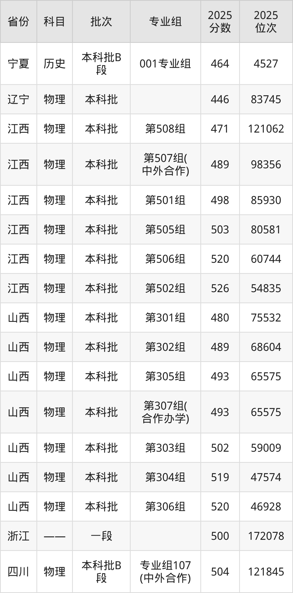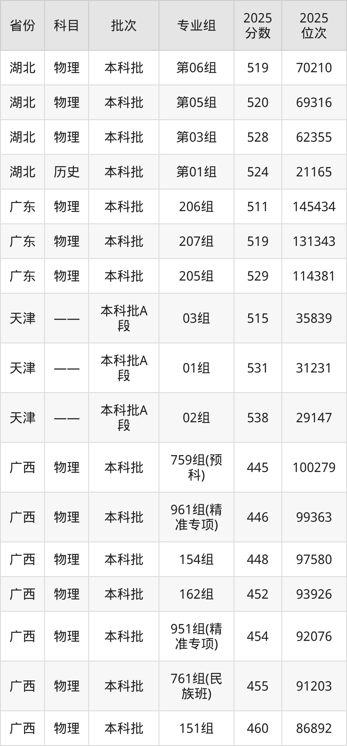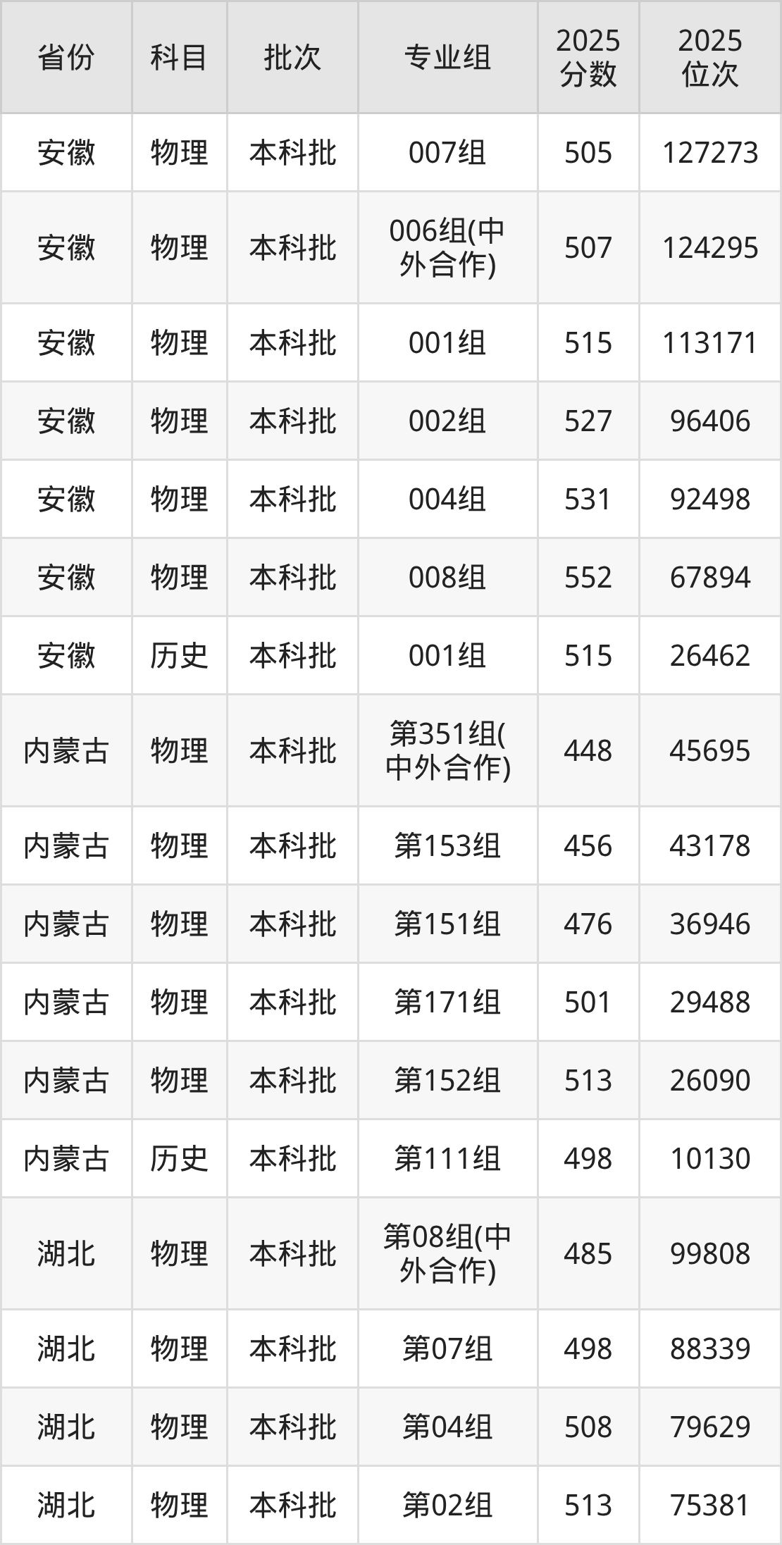2025年在本科物理类进行招生,各专业组分数线详情如下: