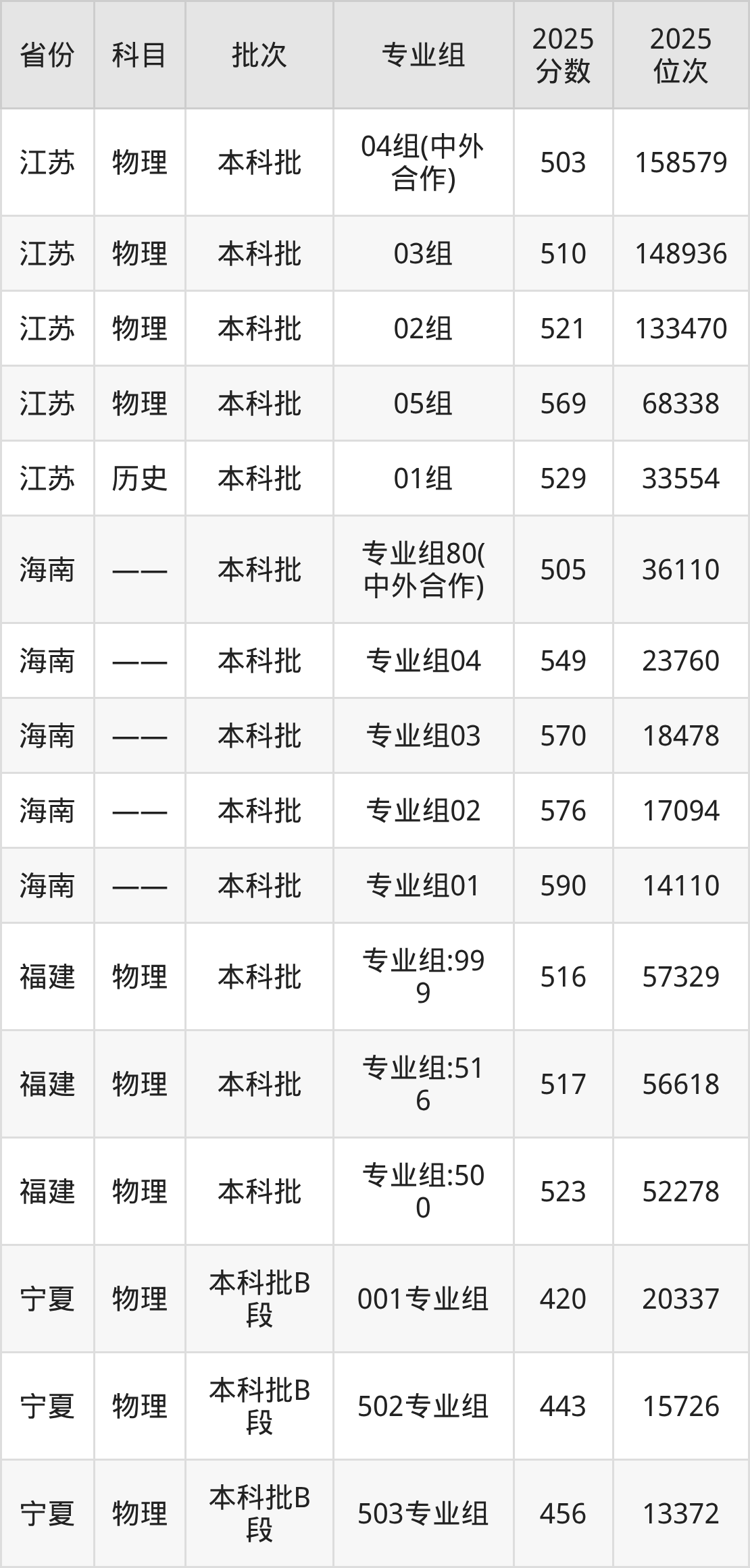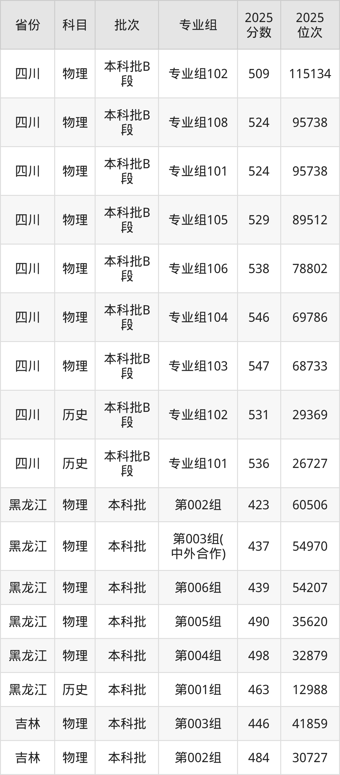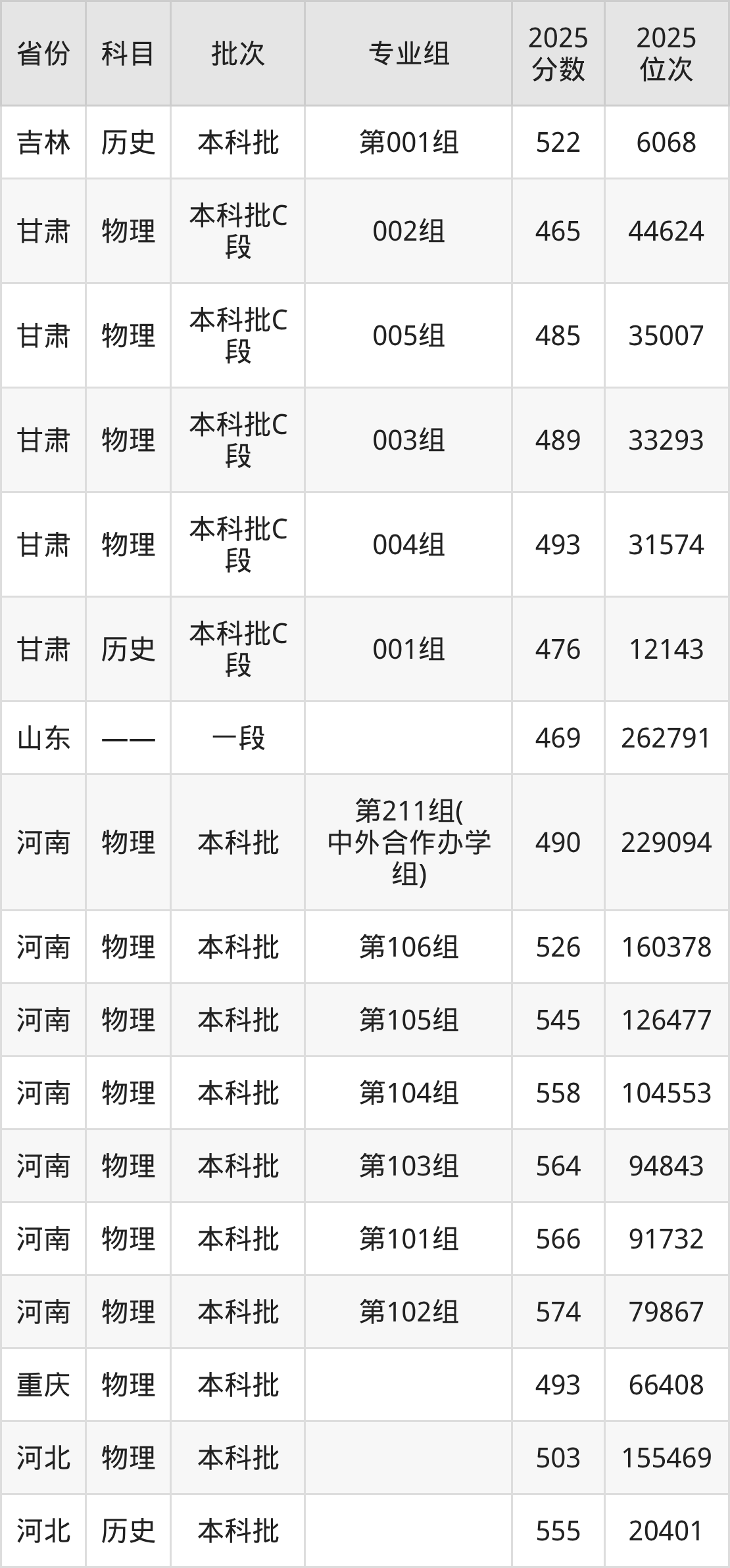 2025年在本科物理类进行招生,各专业组分数线详情如下: