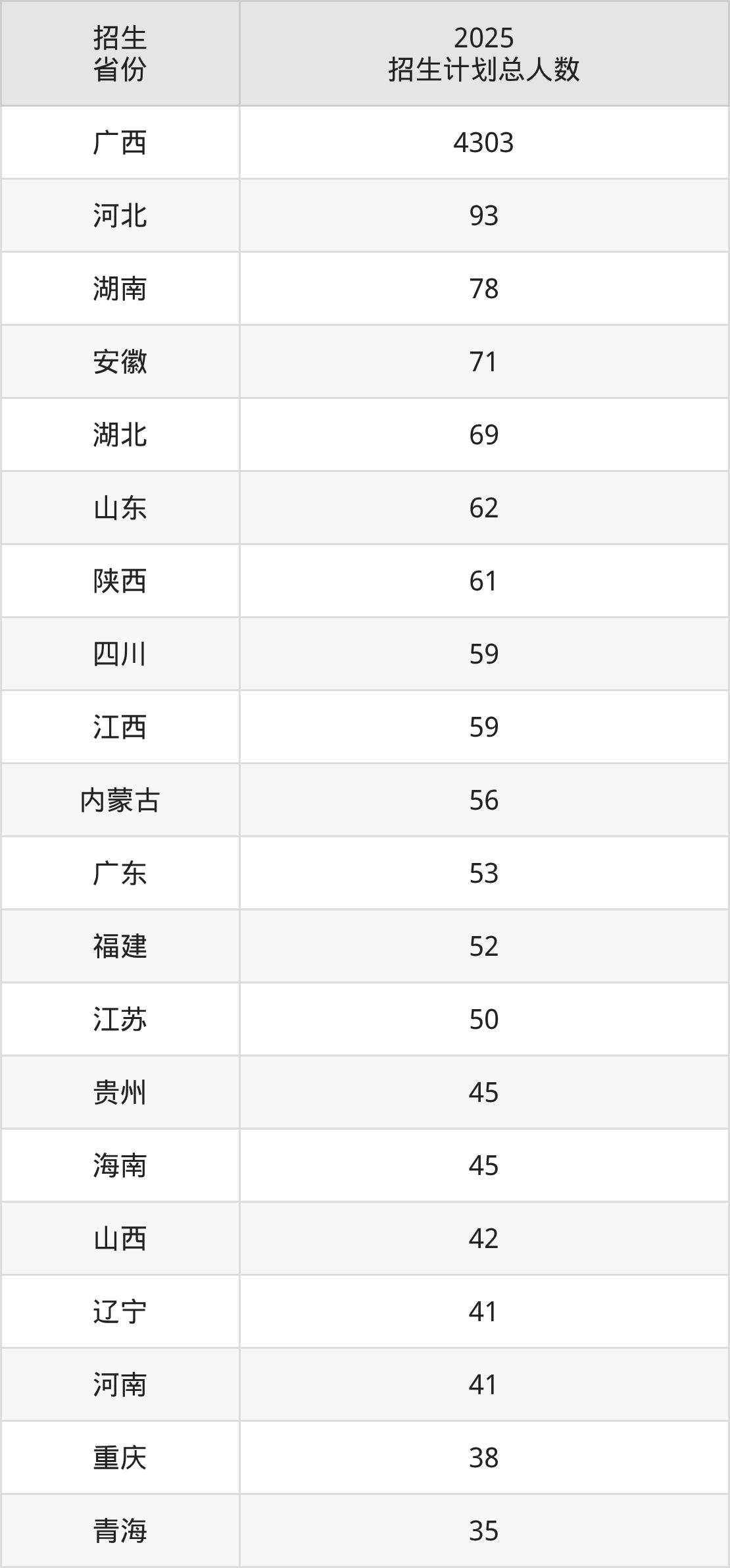 2025年广西科技大学面向全国26个省市开展本科招生;招生专业共42个,招生人数共5519人。2025年在广西壮族自治区招生计划总人数是4303人,其中,广西科技大学在广西壮族自治区招生人数最多的是临床医学。广西科技大学在各省具体招生人数情况如下表。