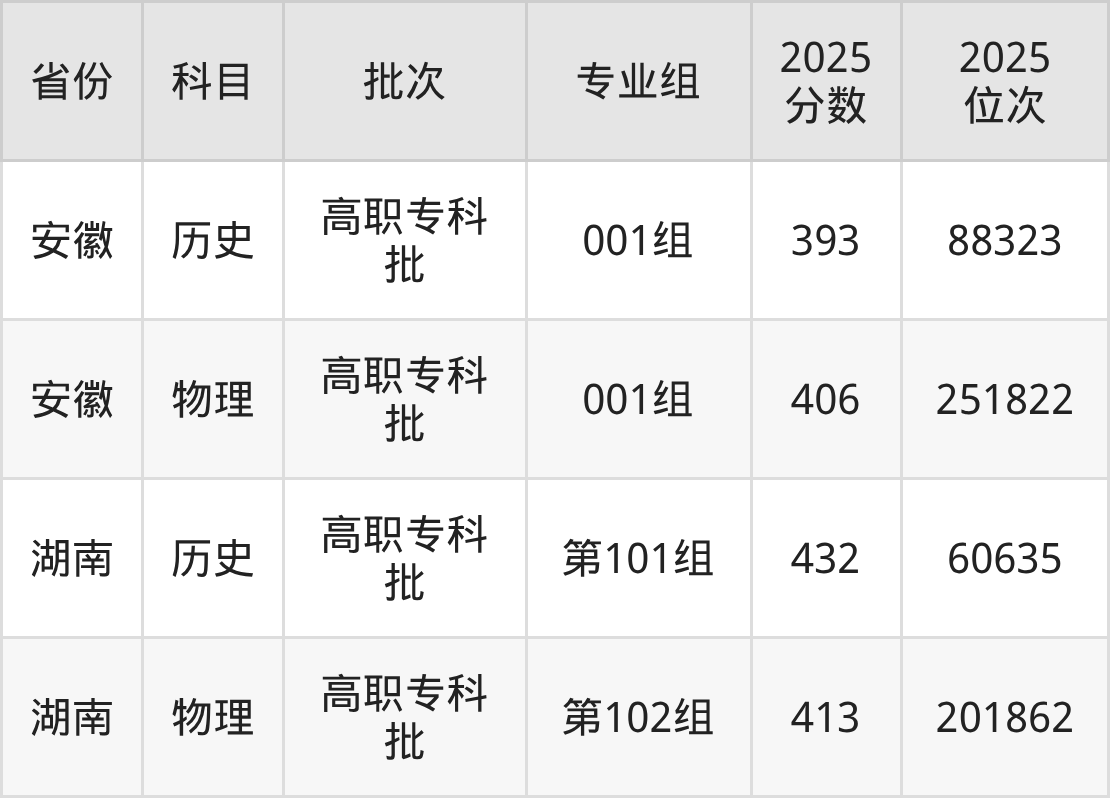 2025年在专科物理类进行招生,各专业组分数线详情如下: