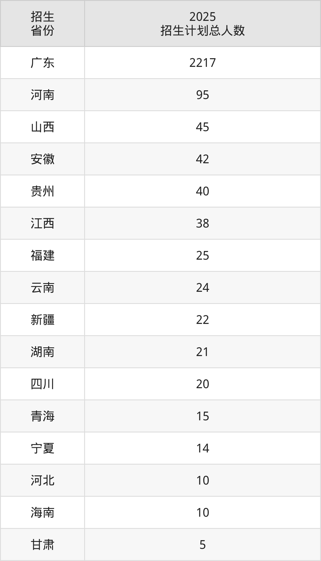 2025年广东交通职业技术学院面向全国17个省市开展专科招生;招生专业共59个,招生人数共2648人。2025年在广东省招生计划总人数是2217人,其中,广东交通职业技术学院在广东省招生人数最多的是无人机应用技术。广东交通职业技术学院在各省具体招生人数情况如下表。