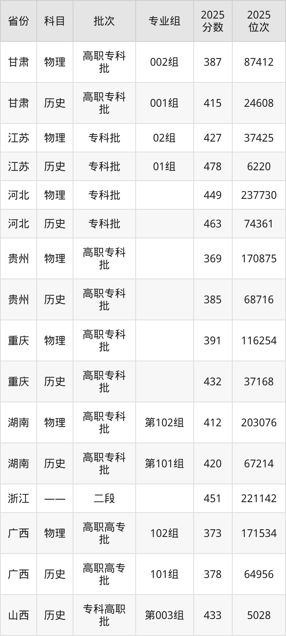 普通类专科物理类最低382分,专科历史类最低444分