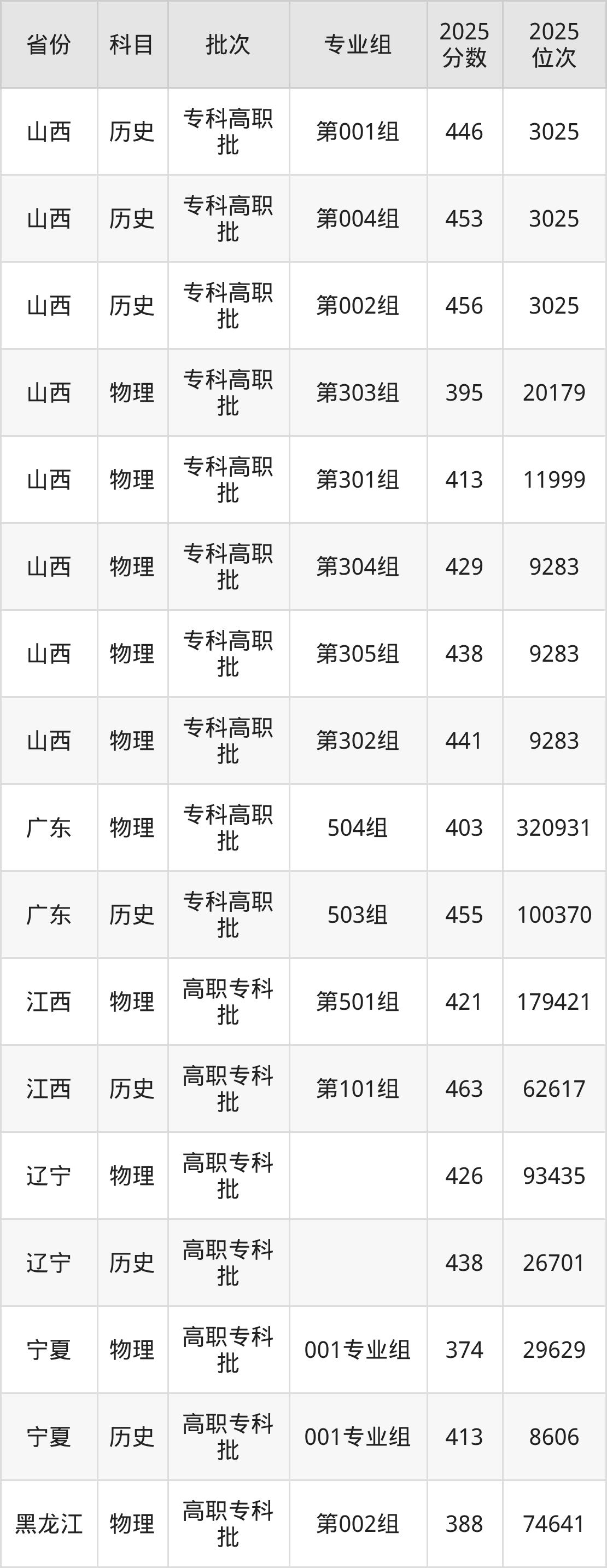 普通类专科历史类最低453分,专科物理类最低448分
