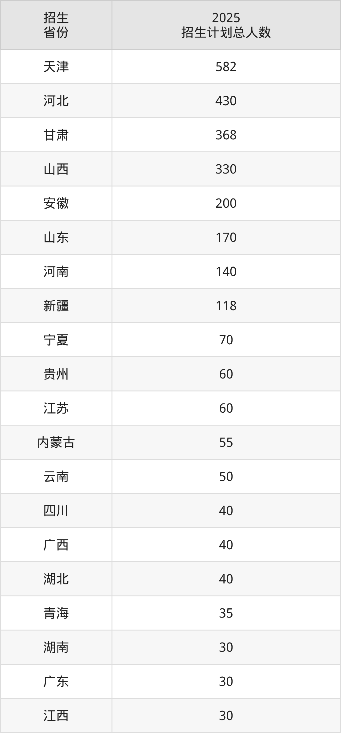 2025年天津铁道职业技术学院面向全国27个省市开展专科招生;招生专业共33个,招生人数共3003人。2025年在天津市招生计划总人数是582人,其中,天津铁道职业技术学院在天津市招生人数最多的是铁道交通运营管理。天津铁道职业技术学院在各省具体招生人数情况如下表。