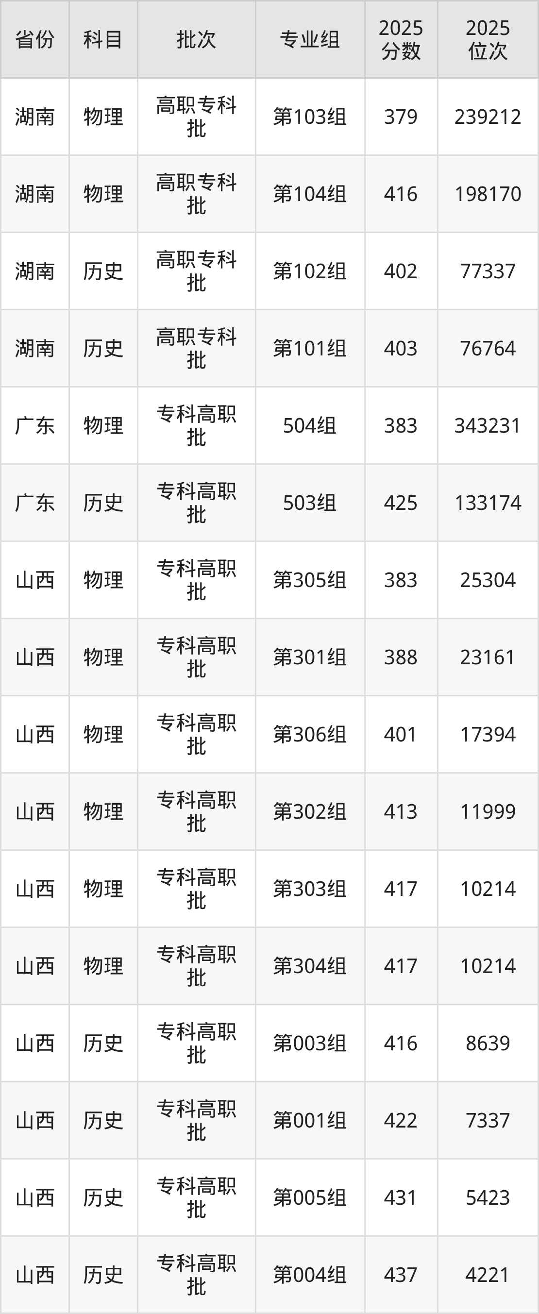 普通类专科物理类最低383分,专科历史类最低416分