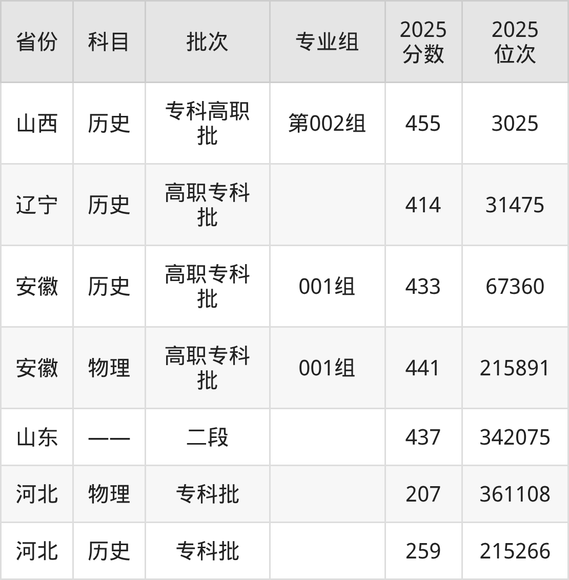 石家庄职业技术学院001组:2025年投档录取最低分为441分,录取最低位次为215891名。