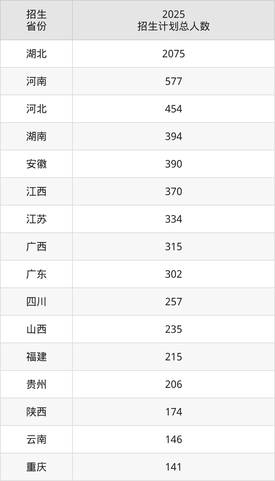 2025年武汉理工大学面向全国28个省市开展本科招生;招生专业共46个,招生人数共7520人。2025年在湖北省招生计划总人数是2075人,其中,武汉理工大学在湖北省招生人数最多的是电子信息类。武汉理工大学在各省具体招生人数情况如下表。