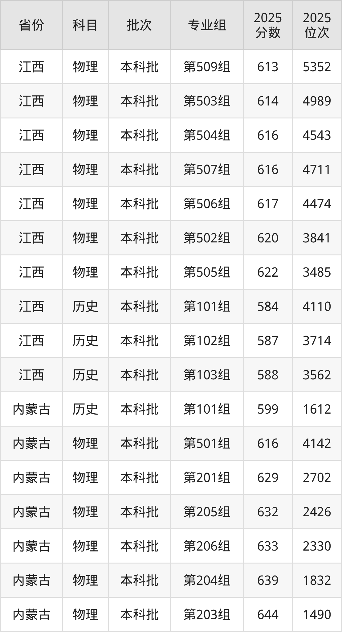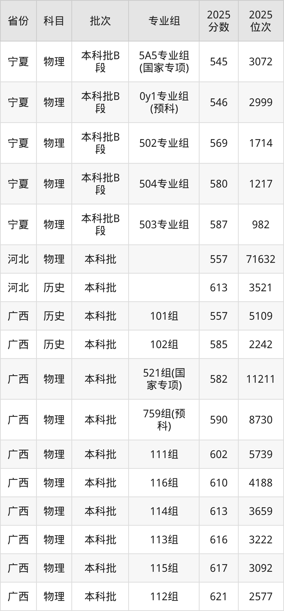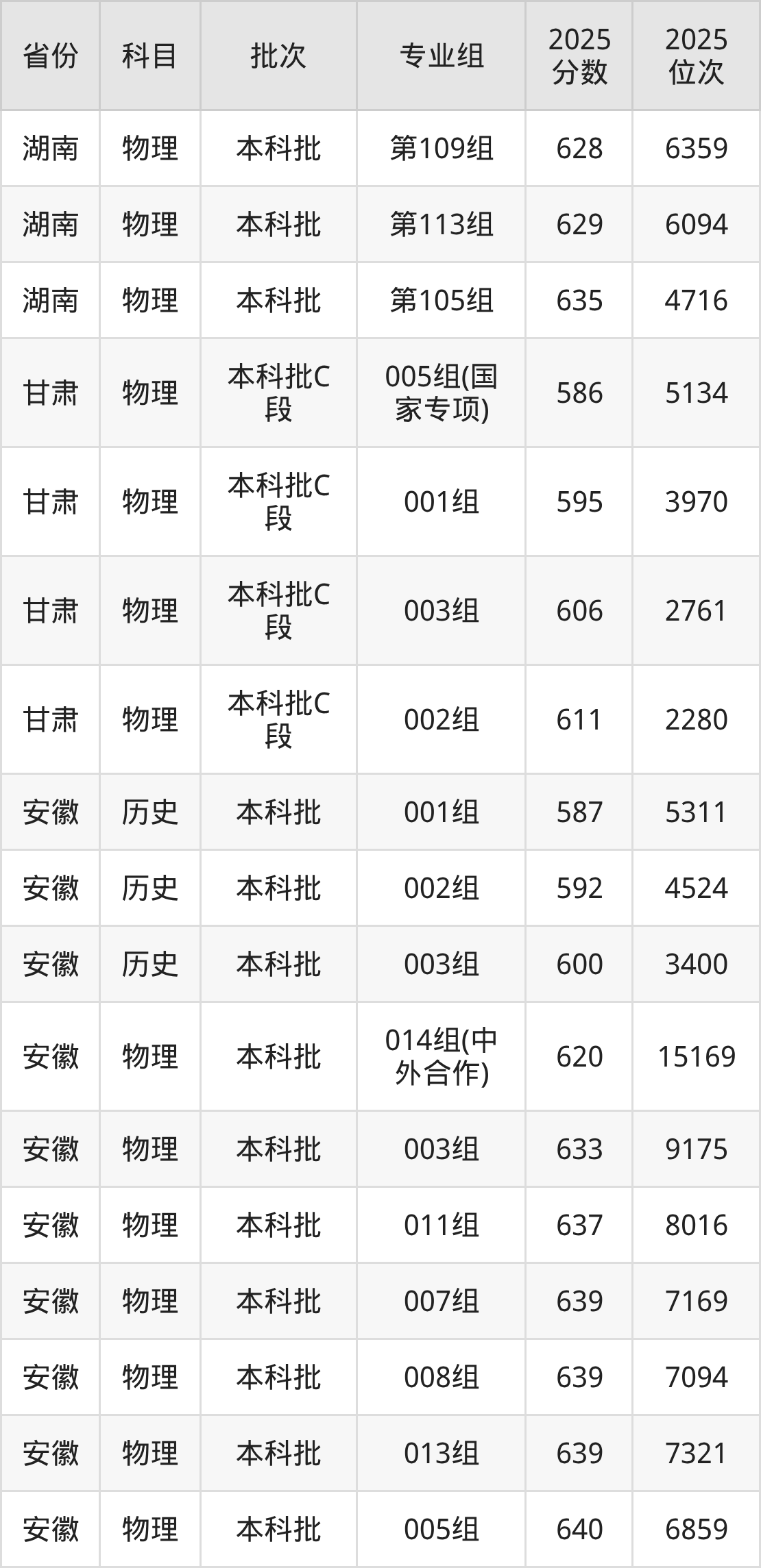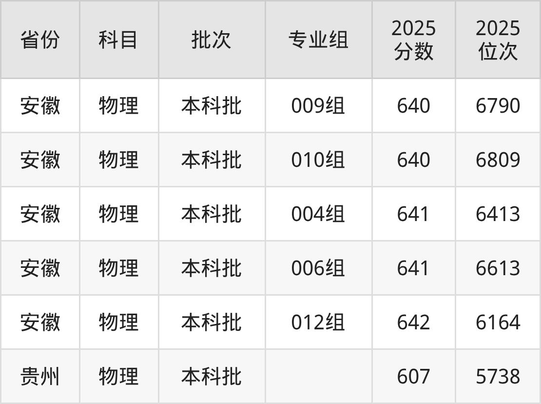 2025年在本科物理类进行招生,各专业组分数线详情如下: