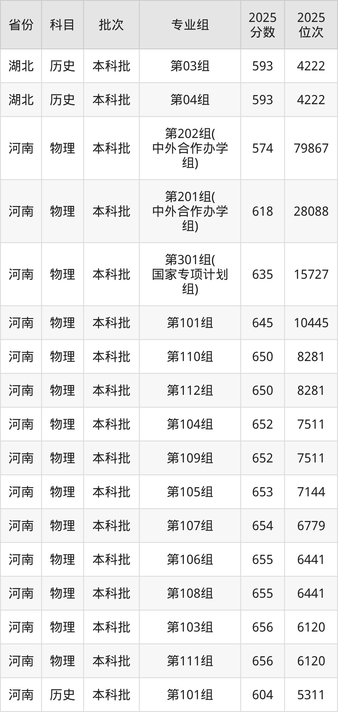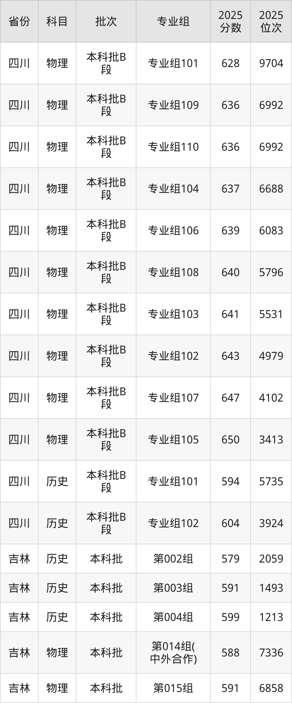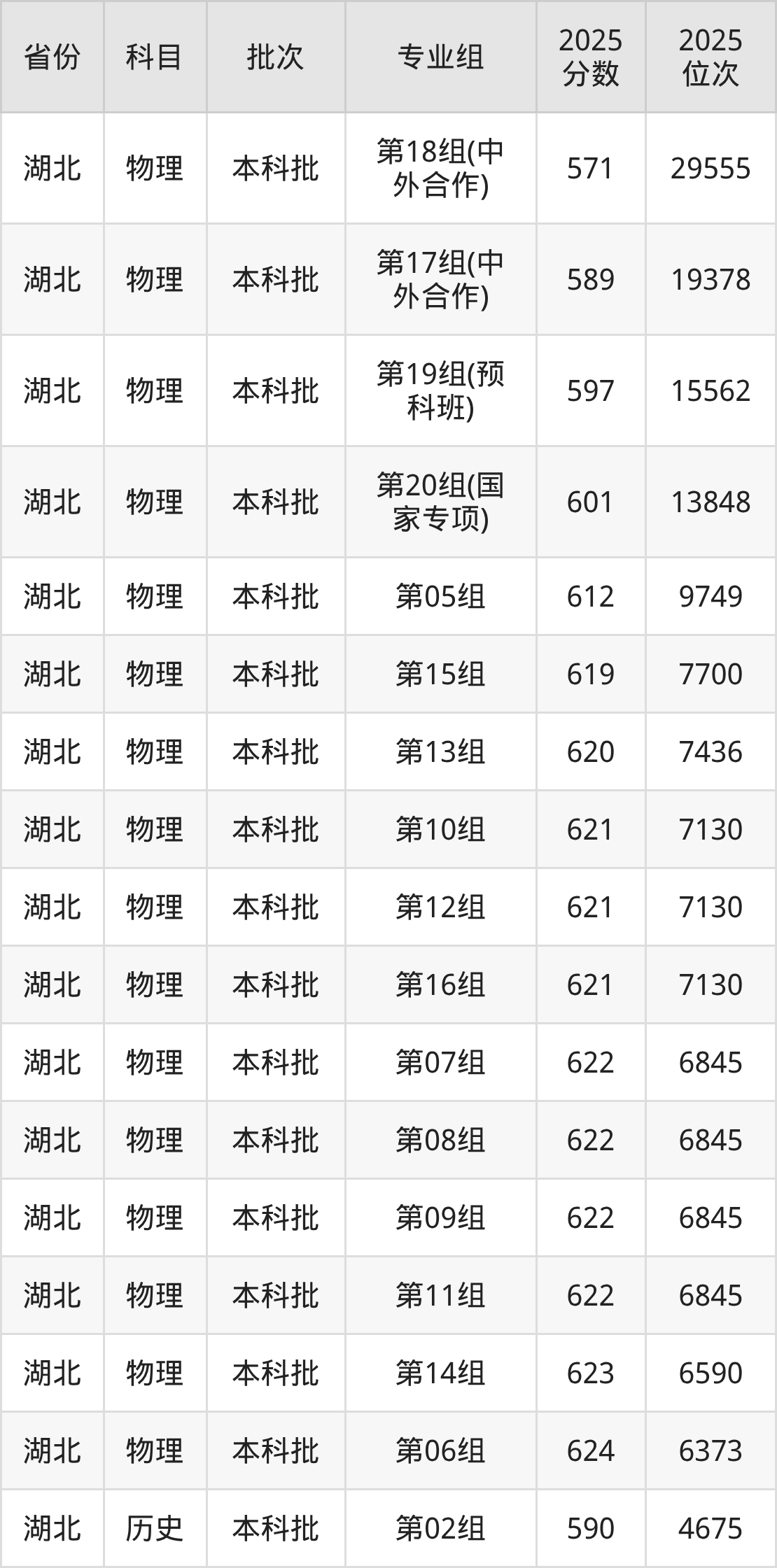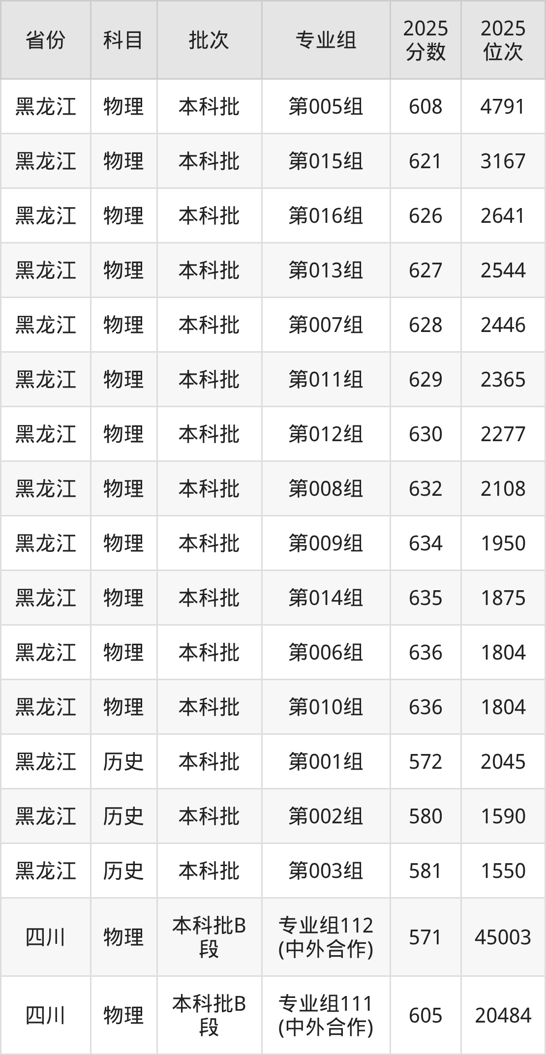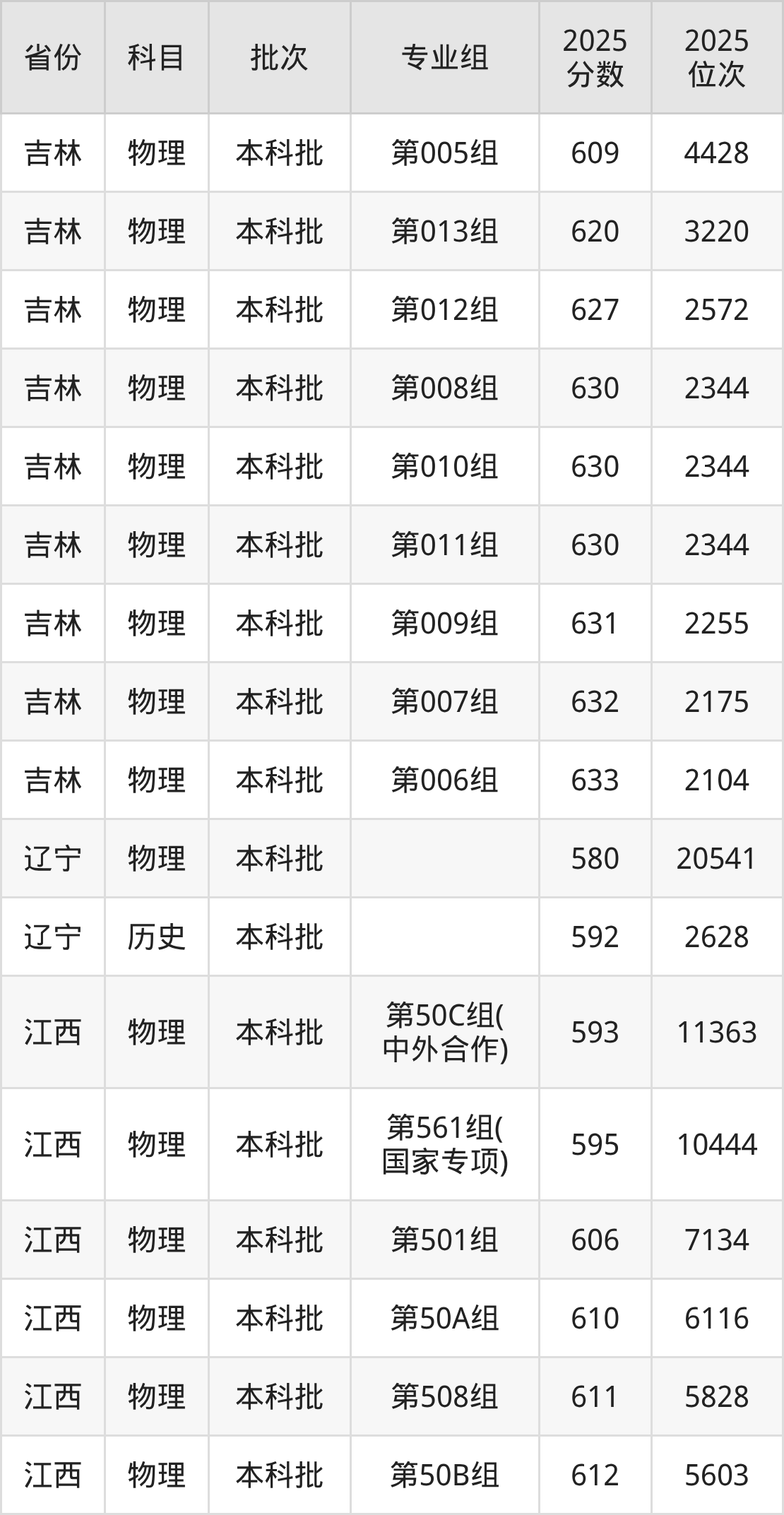 2025年在本科物理类进行招生,各专业组分数线详情如下: