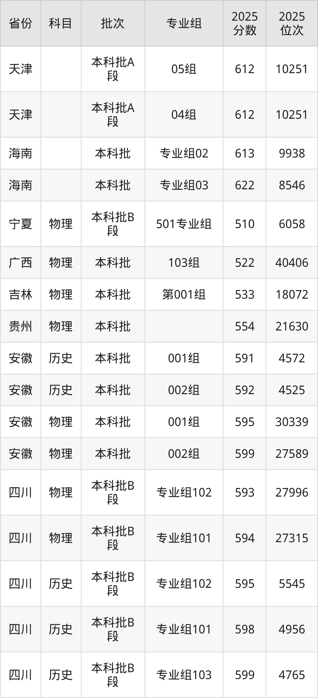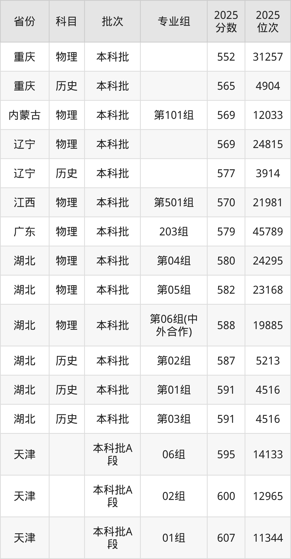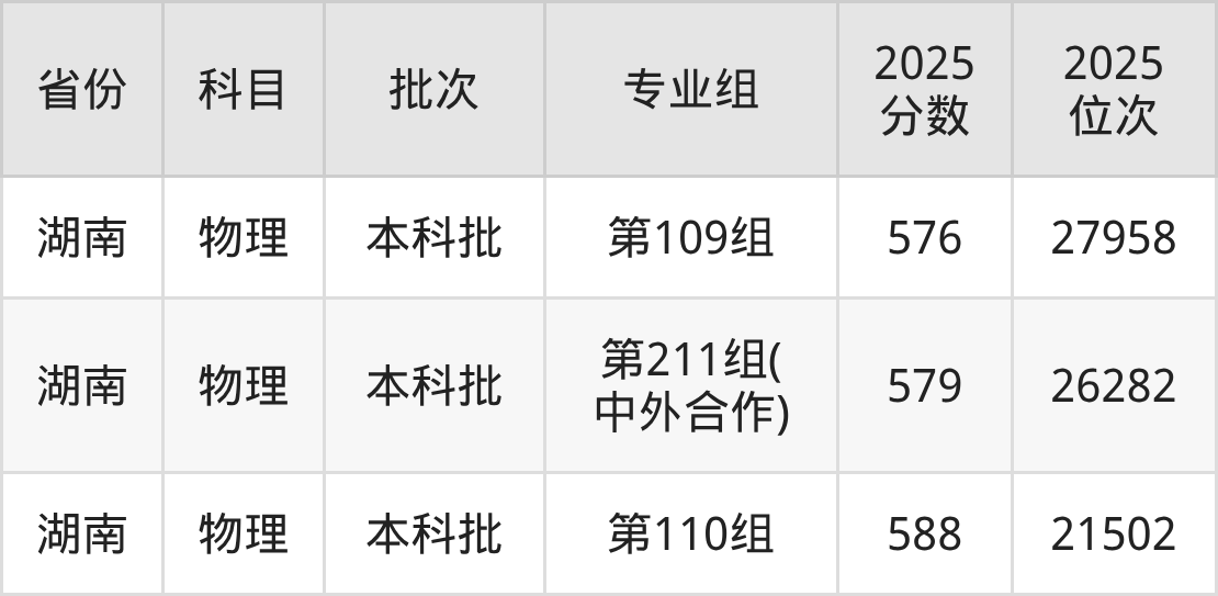2025年在本科物理类进行招生,各专业组分数线详情如下: