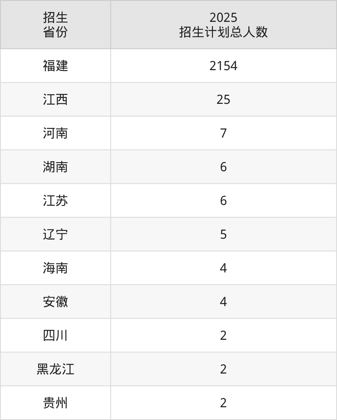 2025年厦门海洋职业技术学院面向全国11个省市开展专科招生;招生专业共33个,招生人数共2217人。2025年在福建省招生计划总人数是2154人,其中,厦门海洋职业技术学院在福建省招生人数最多的是电子信息工程技术。厦门海洋职业技术学院在各省具体招生人数情况如下表。