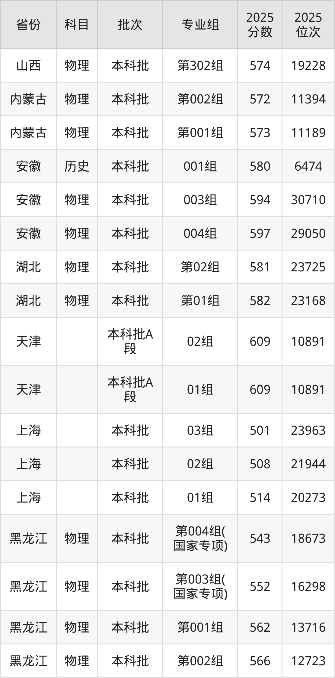 2025年在本科物理类进行招生,各专业组分数线详情如下: