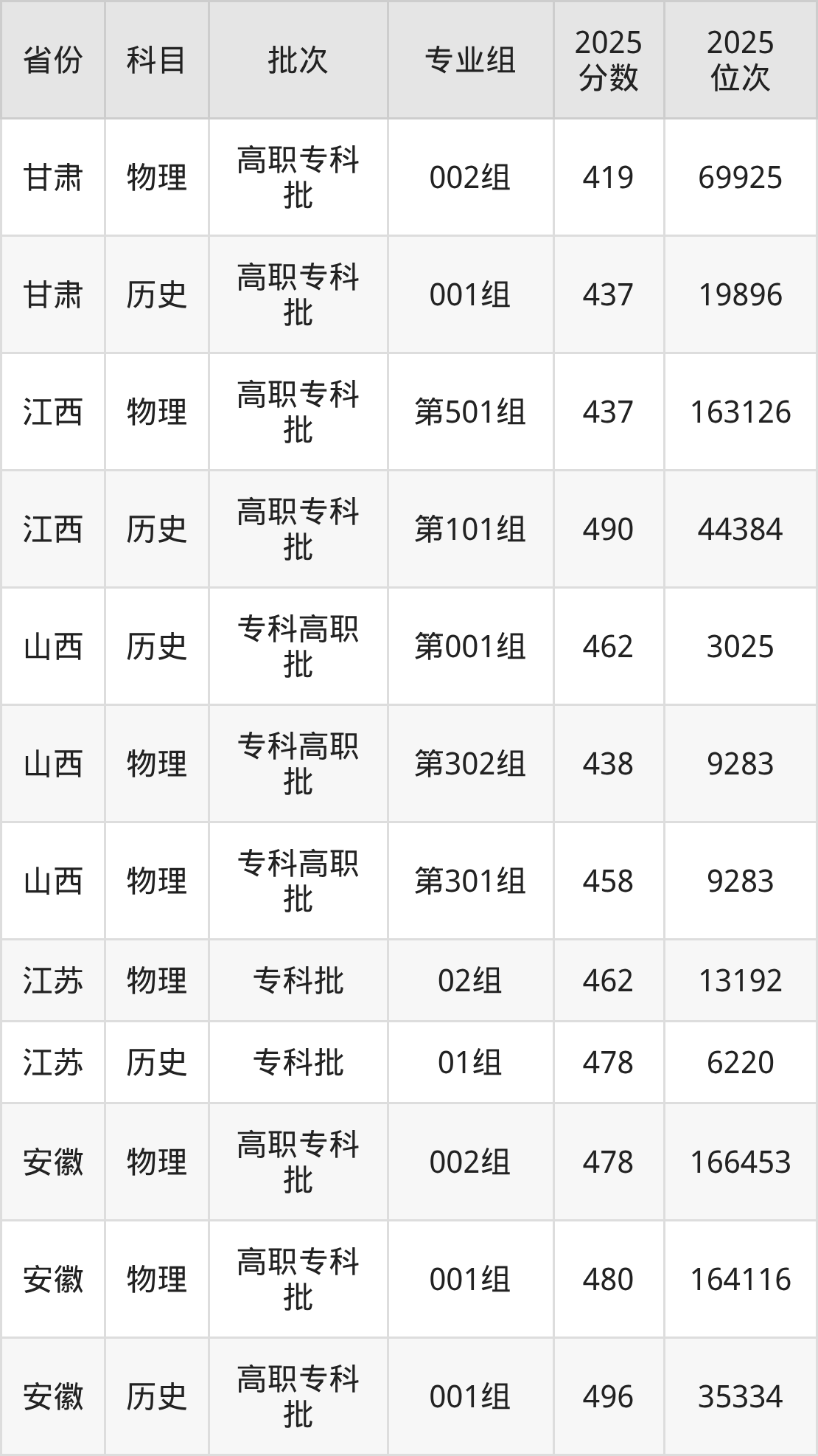 2025年郑州铁路职业技术学院全国录取分数线是419分到496分,录取最低在甘肃物理类(002组)、录取最高在安徽历史类(001组)。各省各专业组最低分具有差异,详情如下: