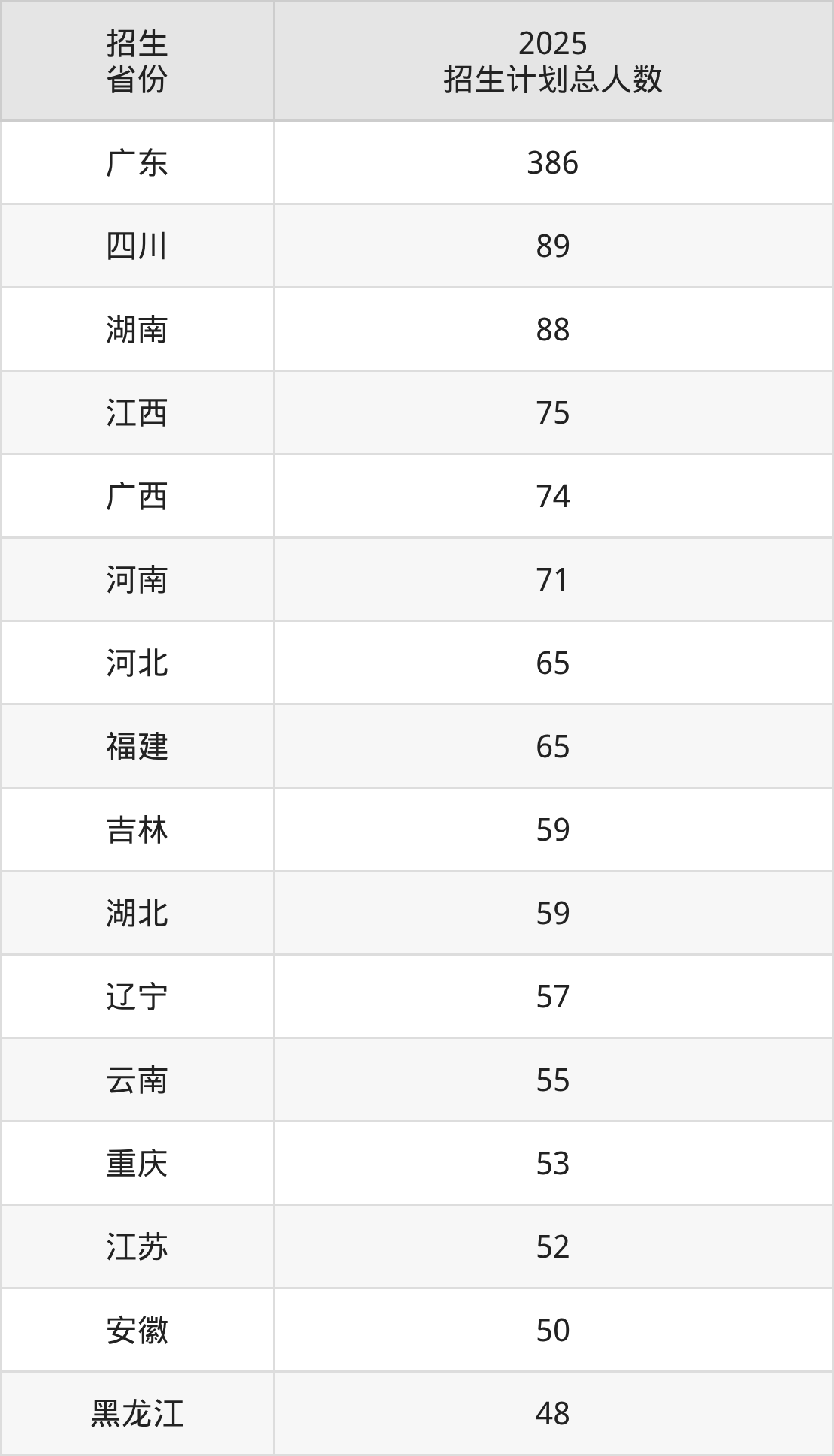 2025年哈尔滨工业大学(深圳)面向全国24个省市开展本科招生;招生专业共4个,招生人数共1478人。2025年在广东省招生计划总人数是386人,其中,哈尔滨工业大学(深圳)在广东省招生人数最多的是工科试验班。哈尔滨工业大学(深圳)在各省具体招生人数情况如下表。