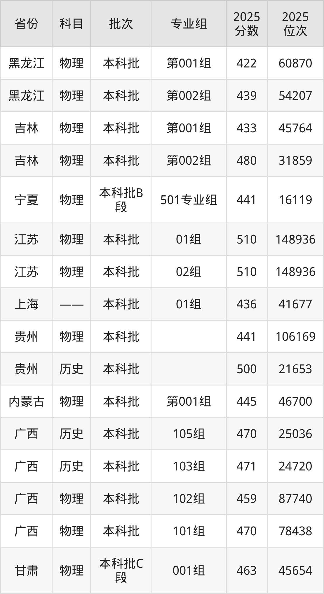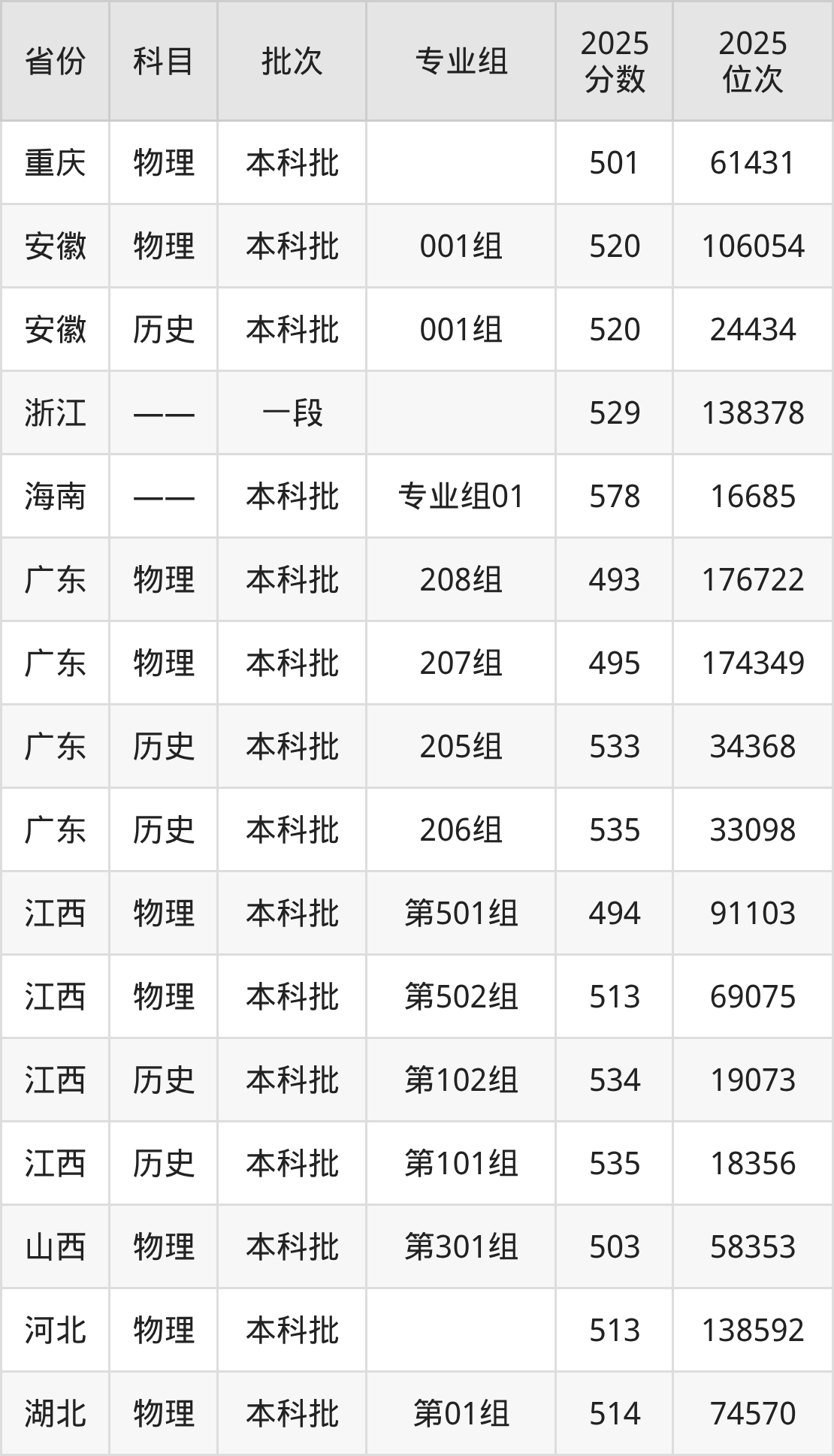 2025年在本科物理类进行招生,各专业组分数线详情如下: