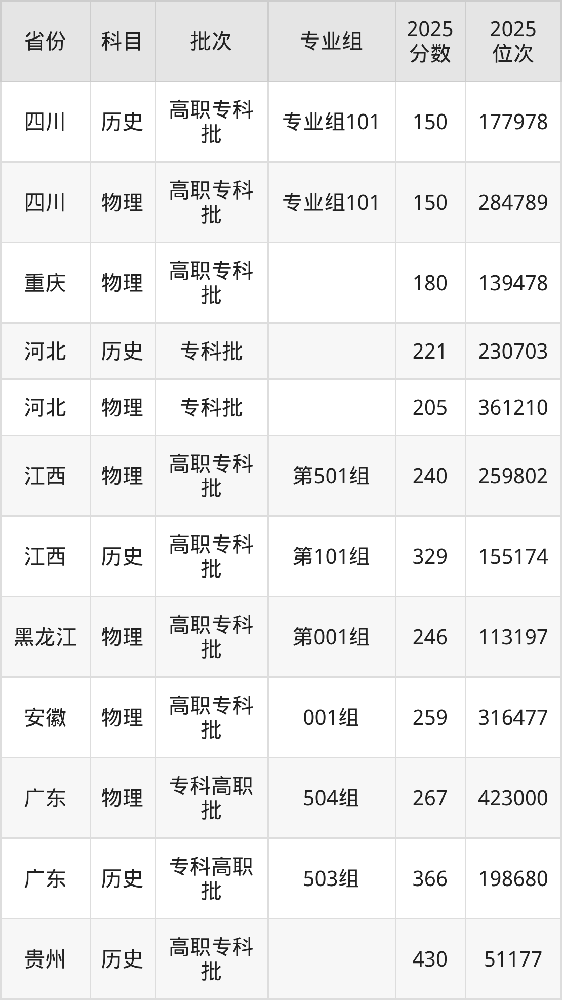 漳州科技职业学院专业组101:2025年投档录取最低分为150分,录取最低位次为177978名。