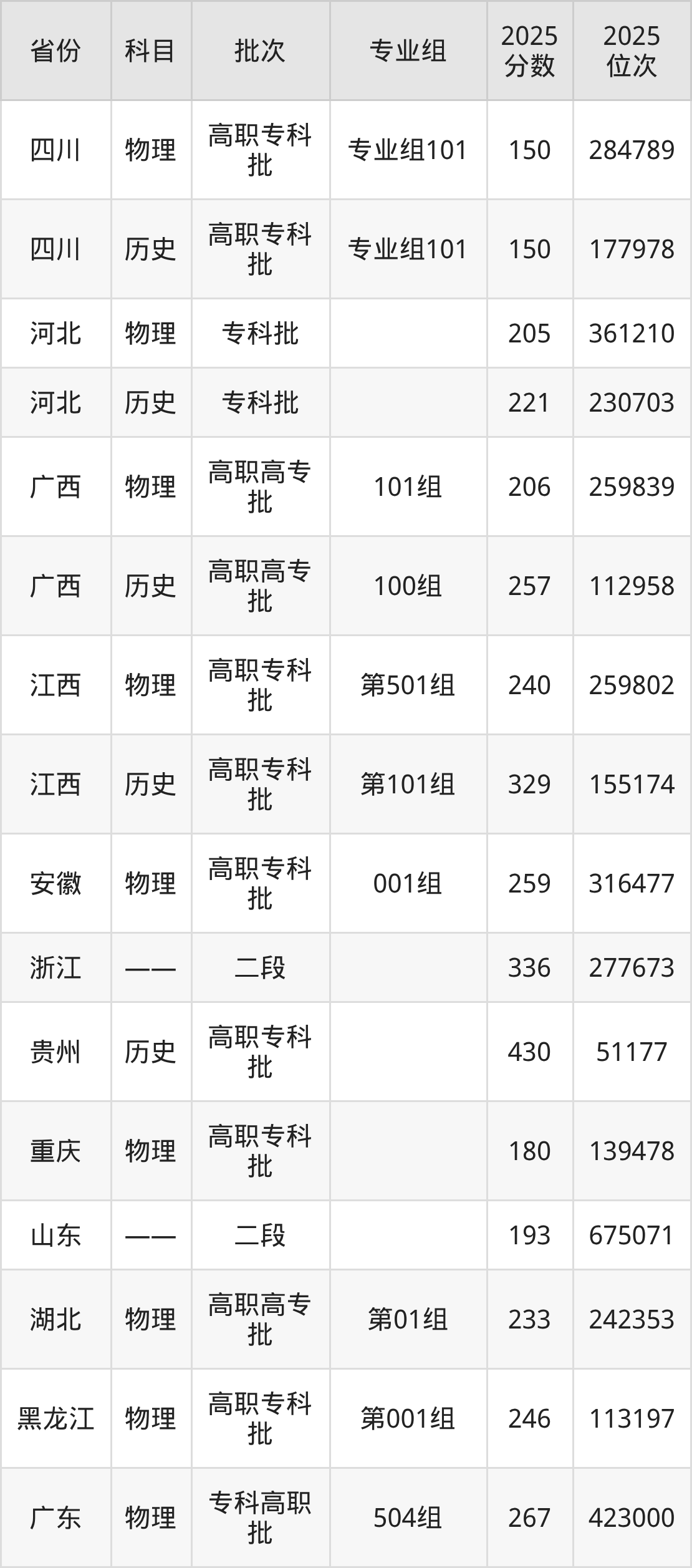 2025年在专科物理类进行招生,各专业组分数线详情如下: