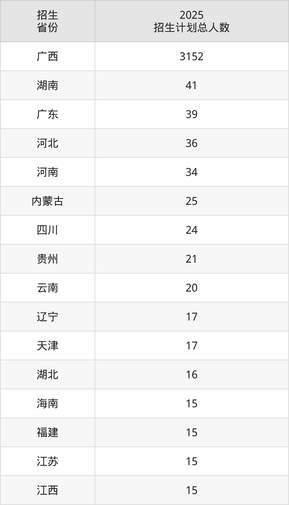 2025年桂林师范学院面向全国16个省市开展本科招生;招生专业共3个,招生人数共536人。2025年在广西壮族自治区招生计划总人数是3152人,其中,桂林师范学院在广西壮族自治区招生人数最多的是小学语文教育。桂林师范学院在各省具体招生人数情况如下表。