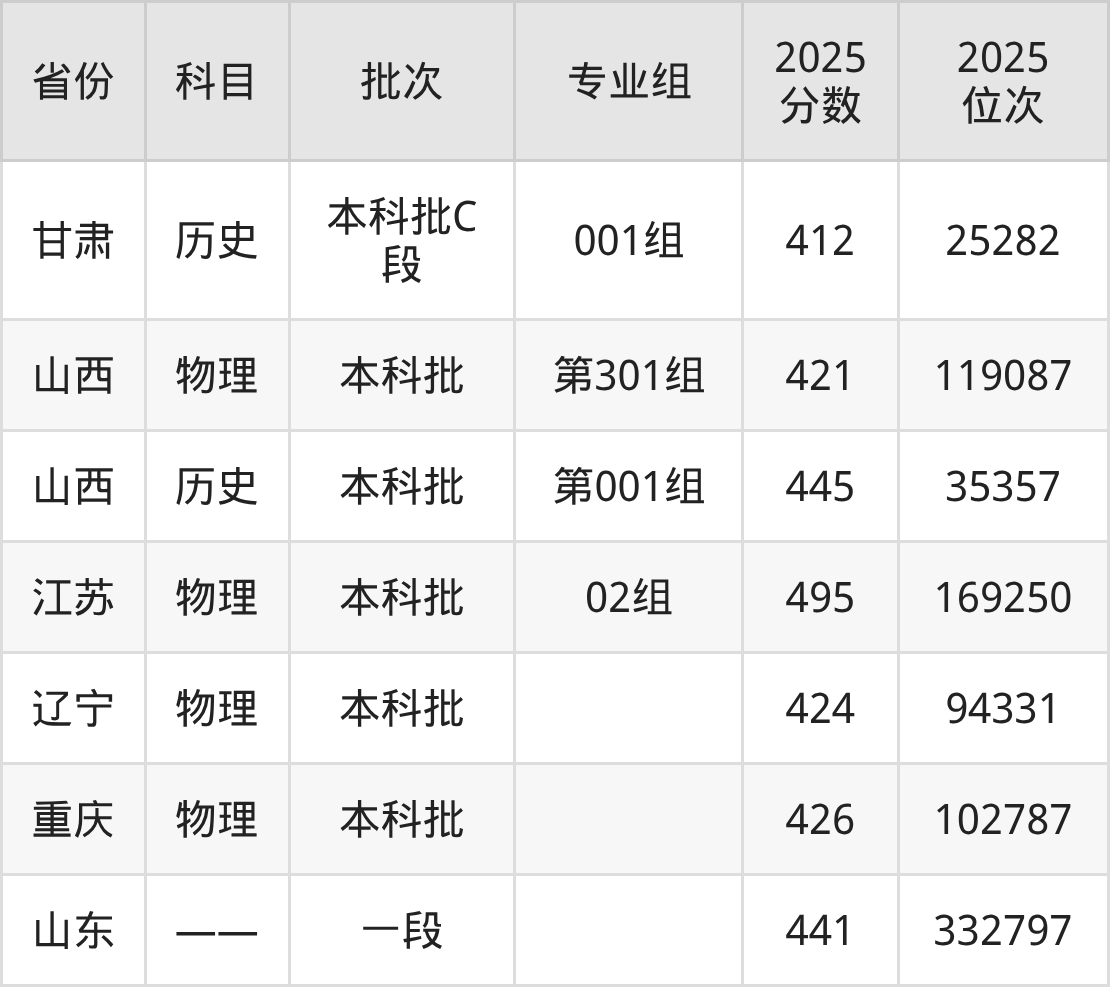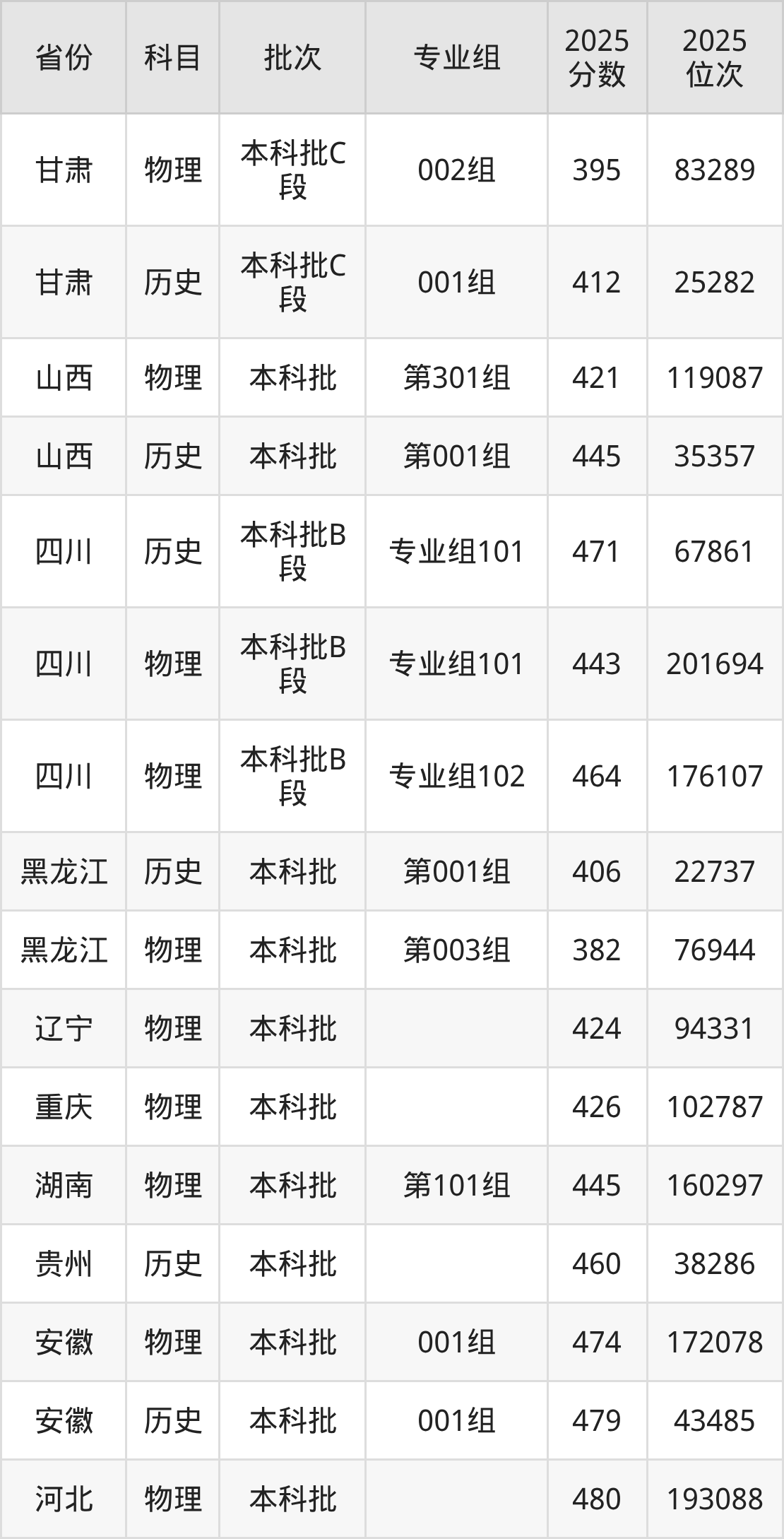 2025年在本科历史类进行招生,各专业组分数线详情如下: