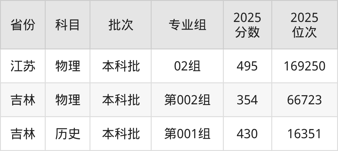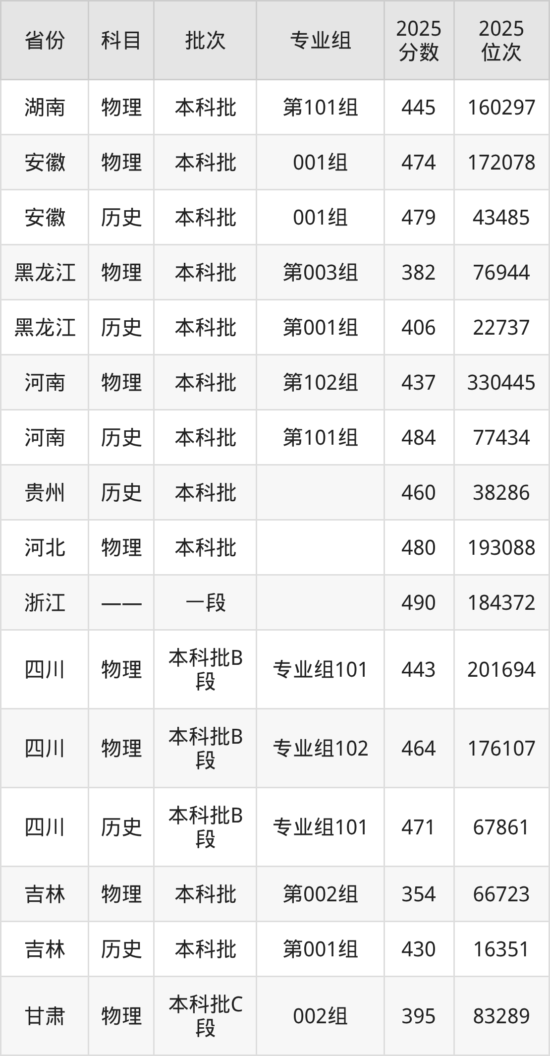 2025年在本科物理类进行招生,各专业组分数线详情如下: