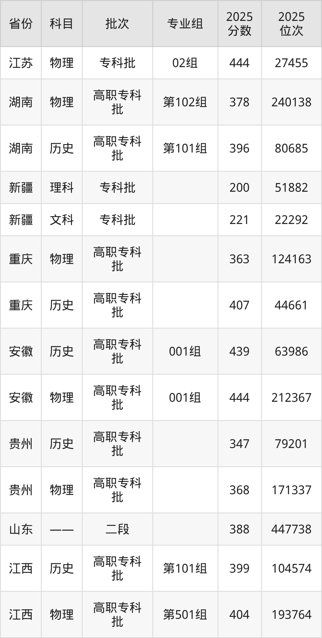 普通类专科物理类最低255分,专科历史类最低370分