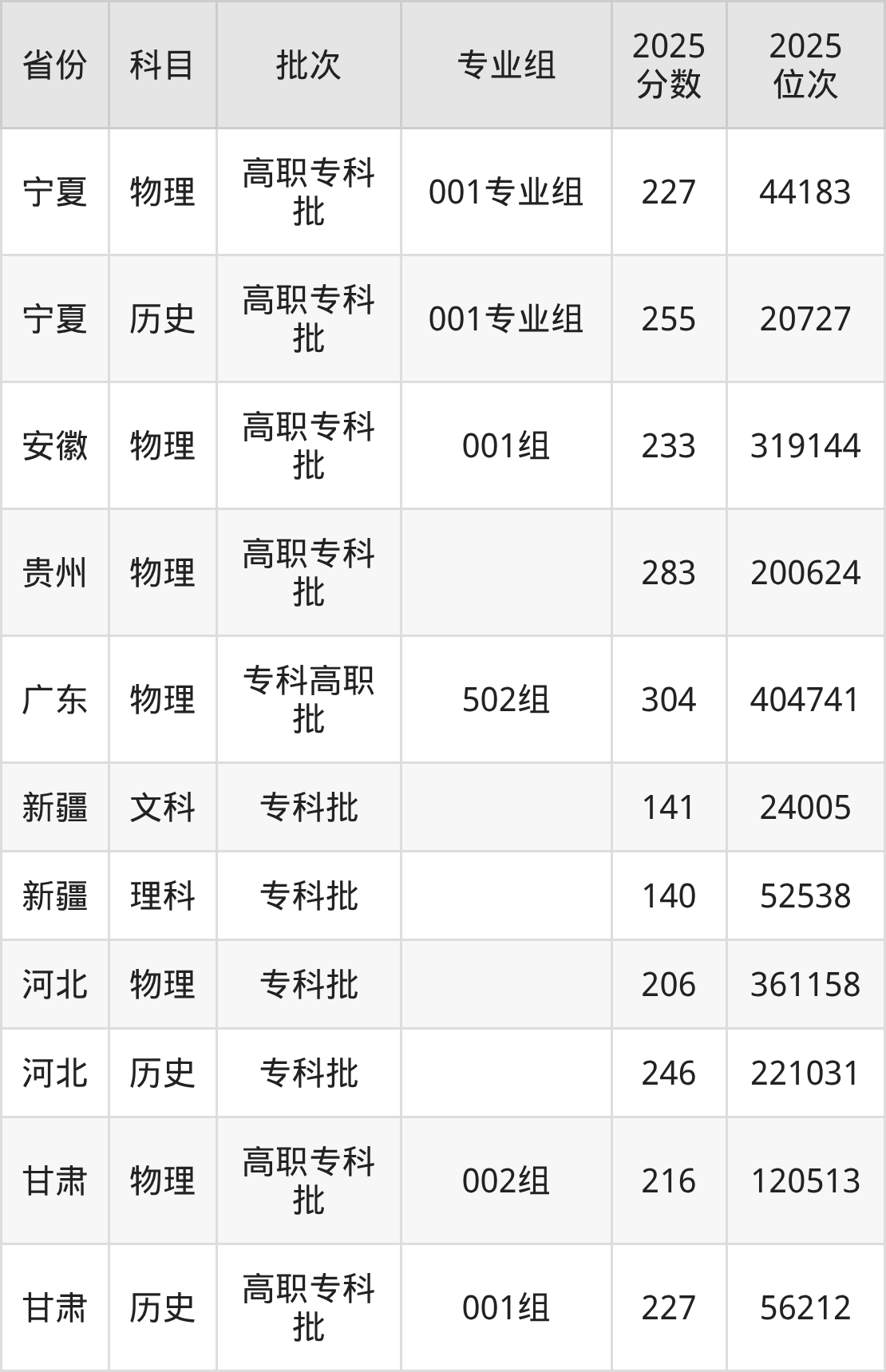 2025年在专科物理类进行招生,各专业组分数线详情如下:
