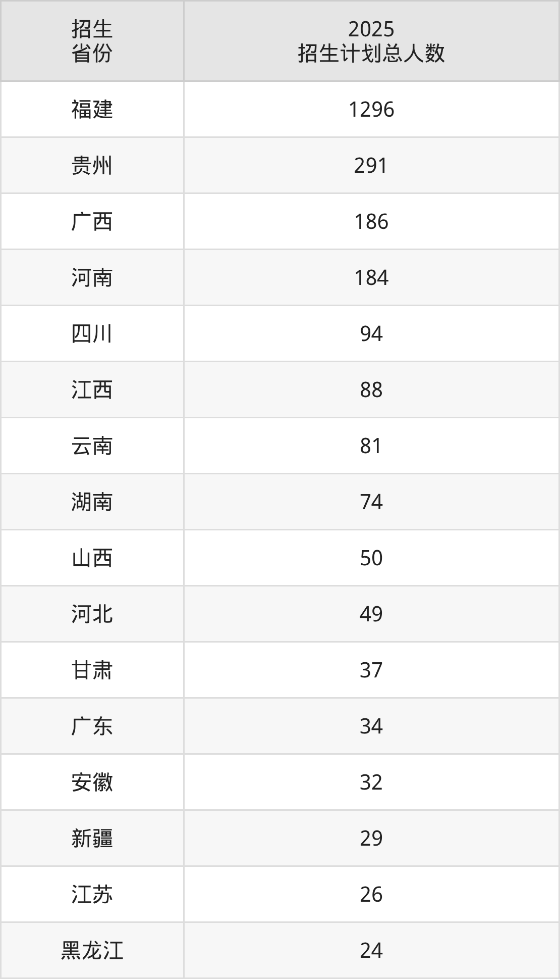 2025年厦门理工学院面向全国28个省市开展本科招生;招生专业共56个,招生人数共2698人。2025年在福建省招生计划总人数是1296人,其中,厦门理工学院在福建省招生人数最多的是计算机科学与技术。厦门理工学院在各省具体招生人数情况如下表。