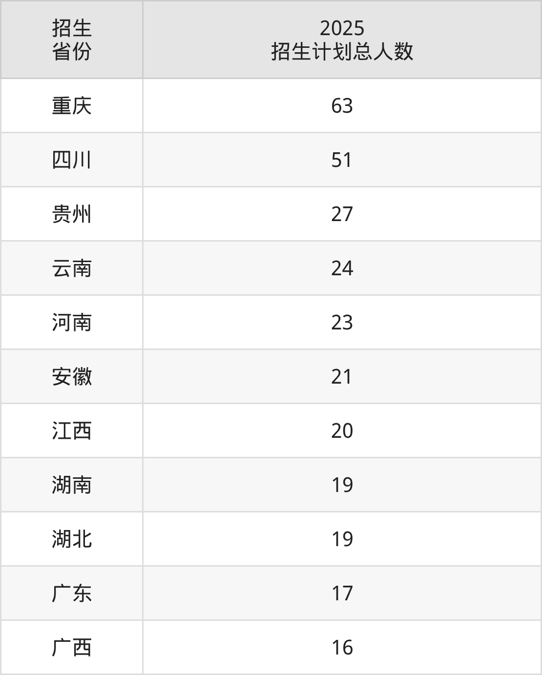 2025年陆军军医大学面向全国11个省市开展本科招生;招生专业共7个,招生人数共300人。2025年在重庆市招生计划总人数是63人,其中,陆军军医大学在重庆市招生人数最多的是临床医学。陆军军医大学在各省具体招生人数情况如下表。