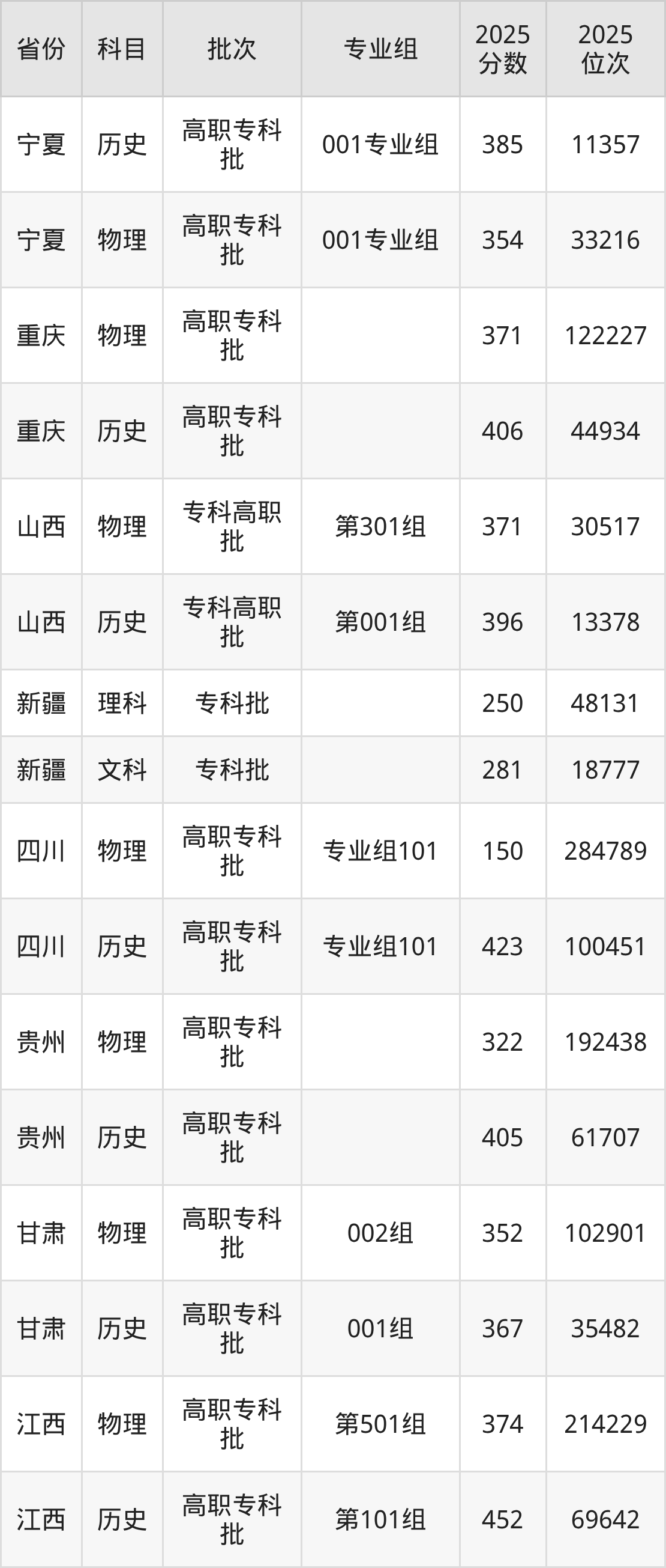 2025年渭南职业技术学院全国录取分数线是150分到452分,录取最低在四川物理类(专业组101)、录取最高在江西历史类(第101组)。各省各专业组最低分具有差异,详情如下: