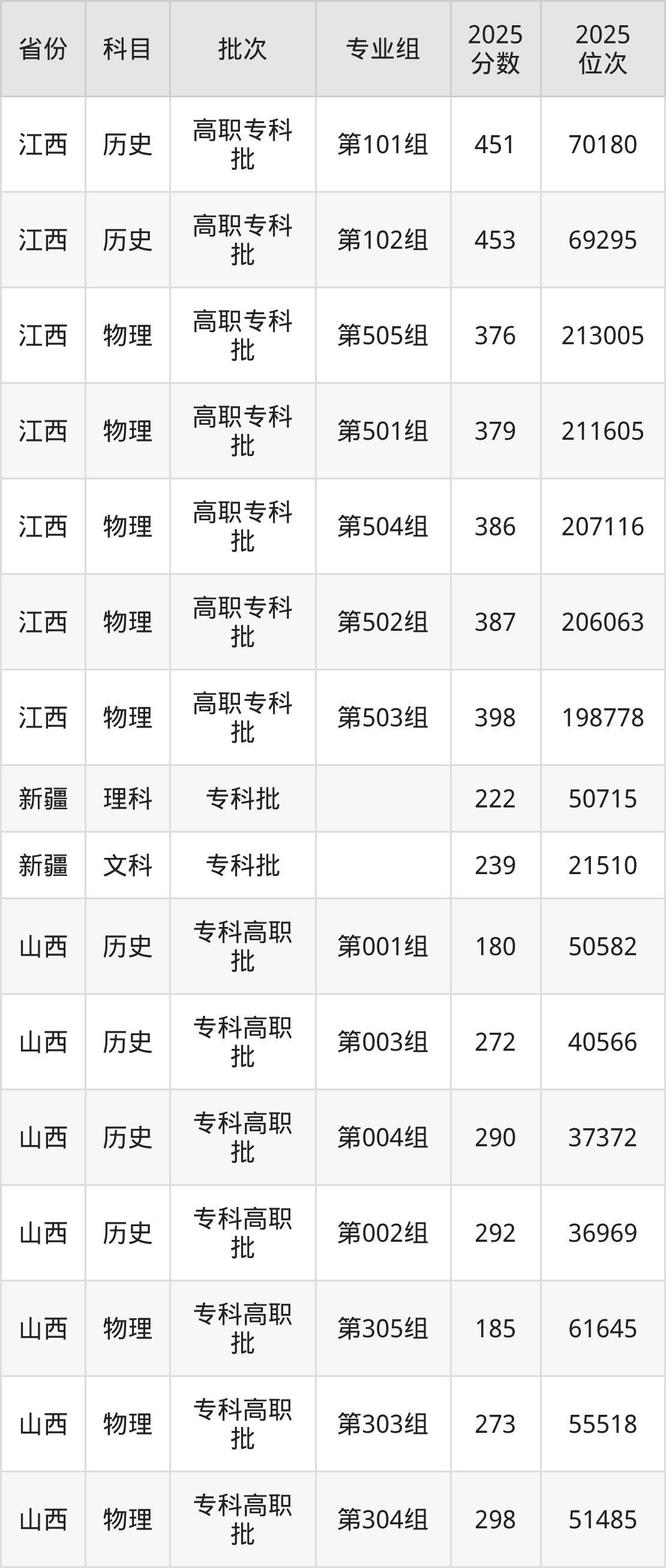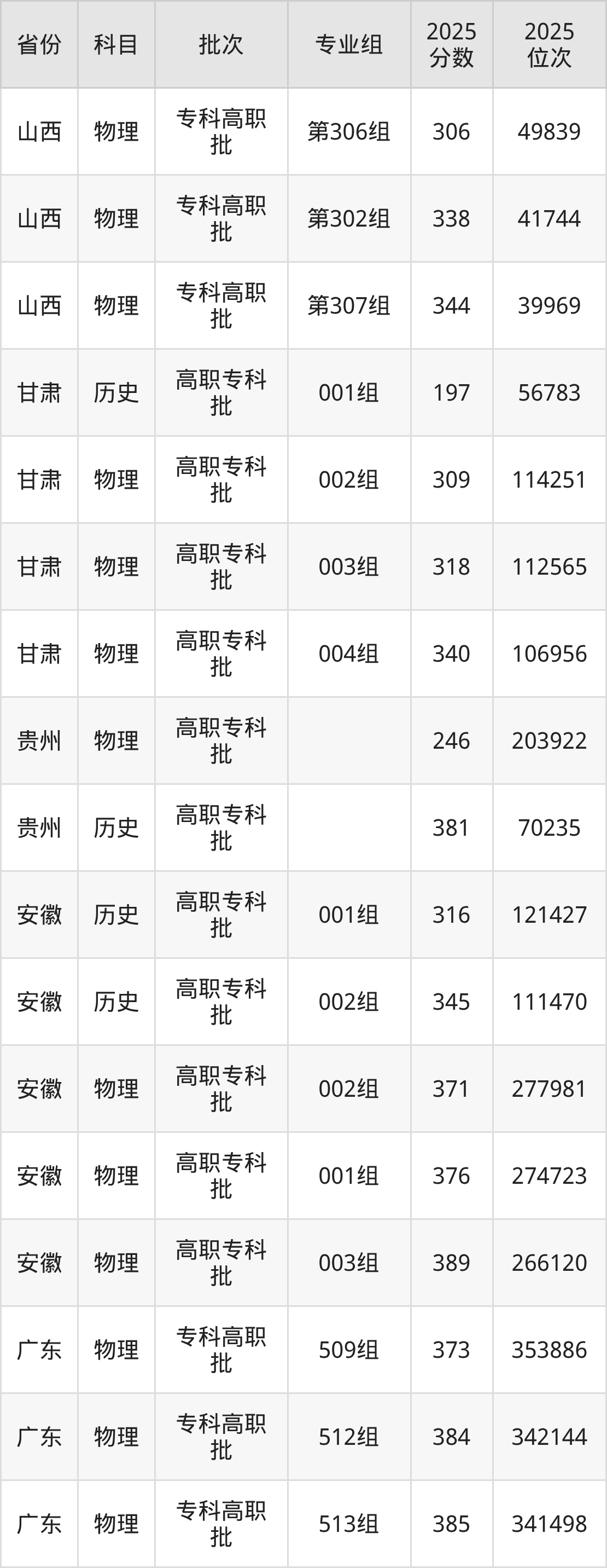 普通类专科历史类最低381分,专科物理类最低246分