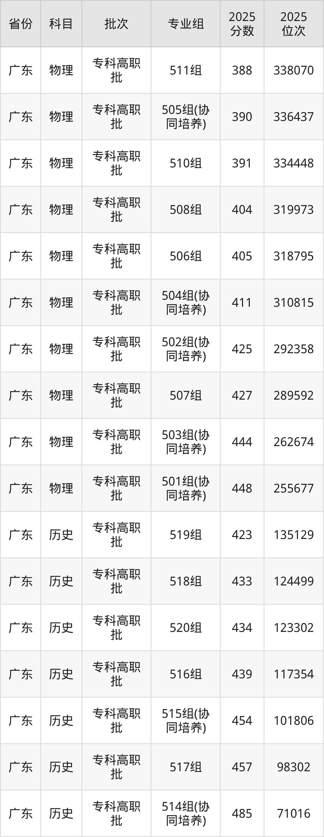 清远职业技术学院003组:2025年投档录取最低分为389分,录取最低位次为266120名。