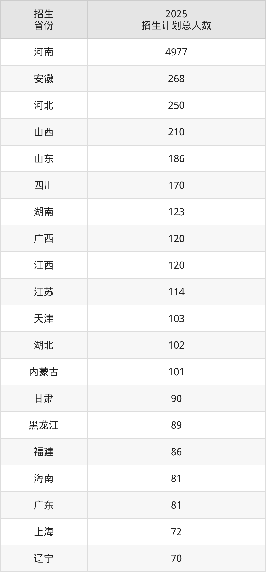 2025年河南工业大学面向全国29个省市开展本科招生;招生专业共57个,招生人数共7833人。2025年在河南省招生计划总人数是4977人,其中,河南工业大学在河南省招生人数最多的是人工智能。河南工业大学在各省具体招生人数情况如下表。