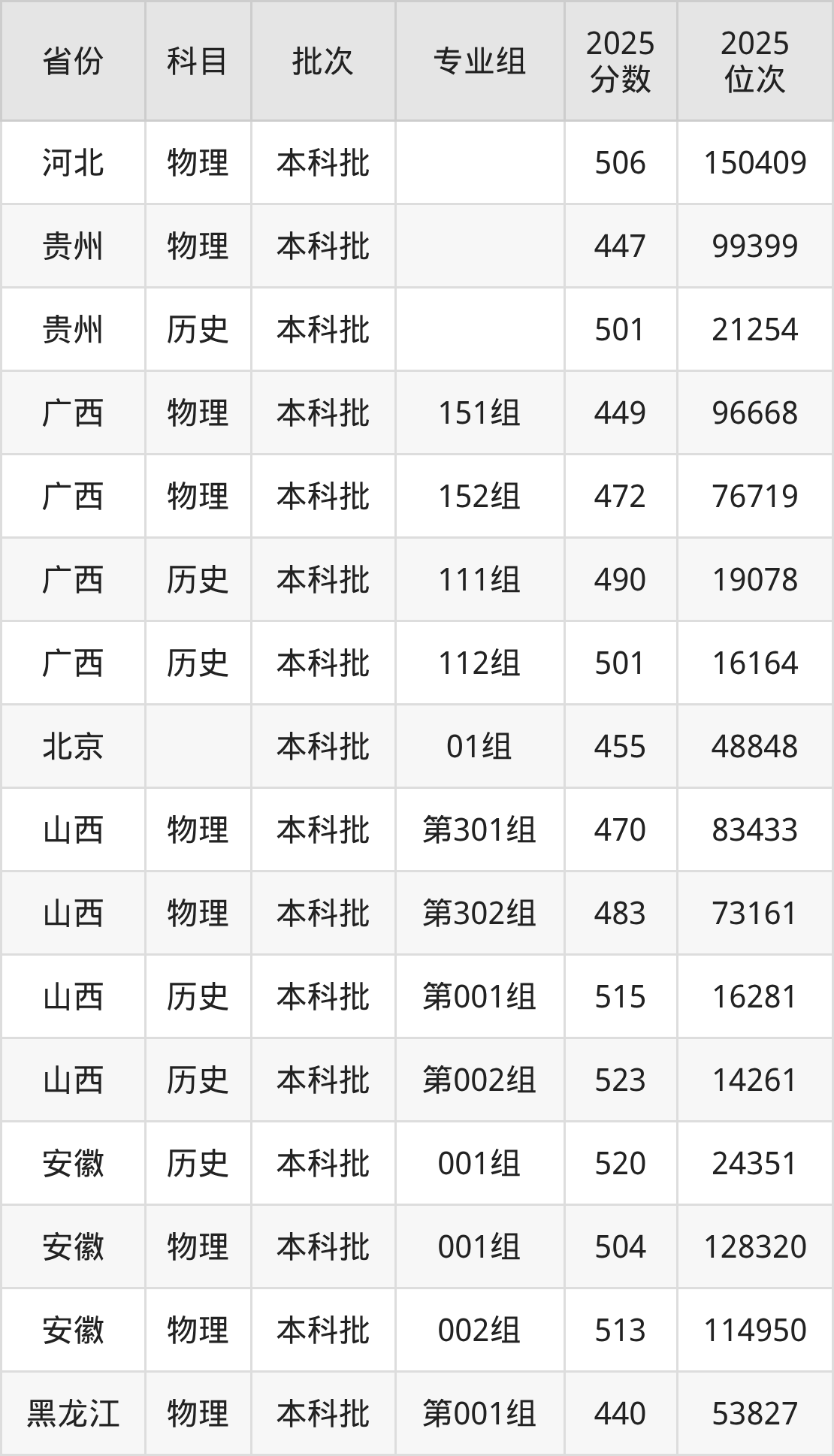 2025年投档录取最低分为447分,录取最低位次为99399名。