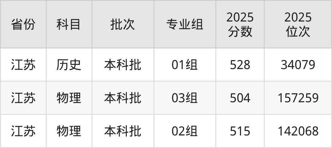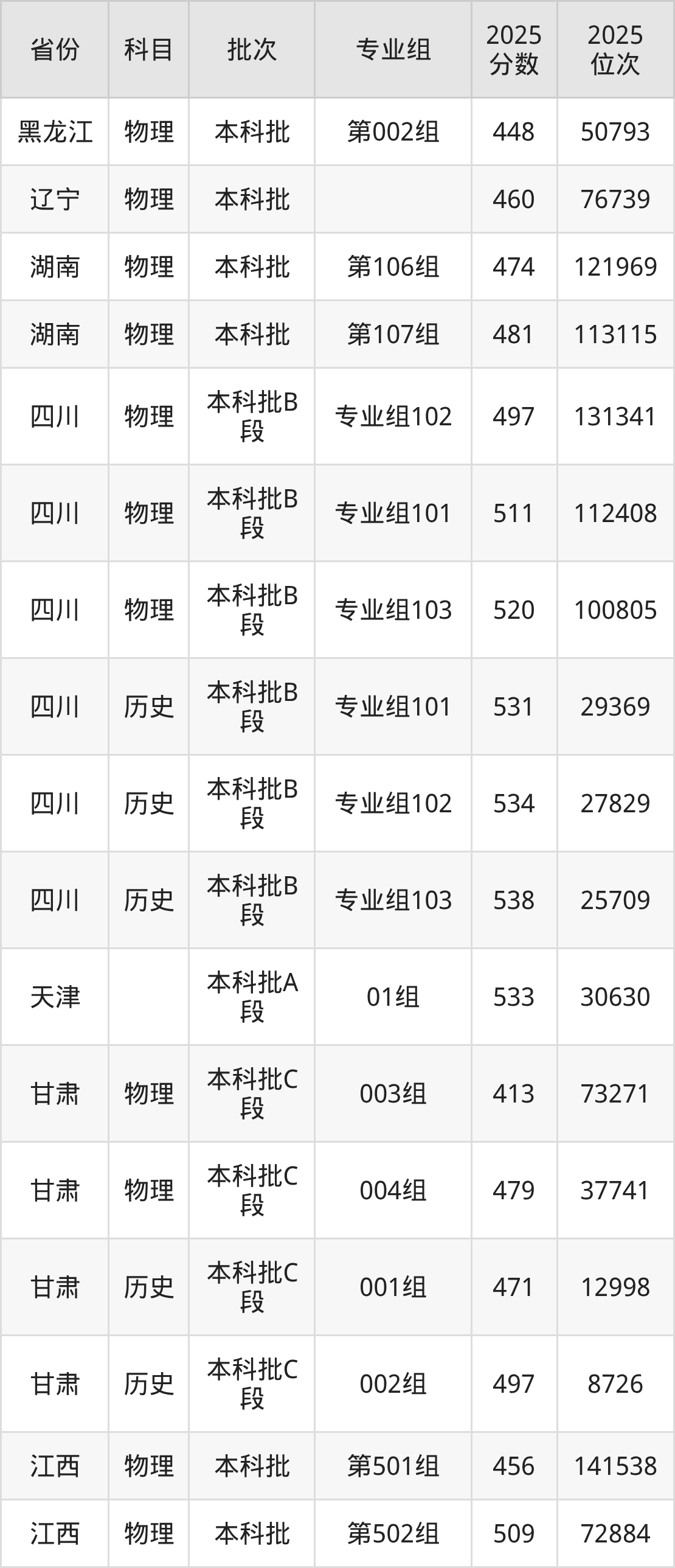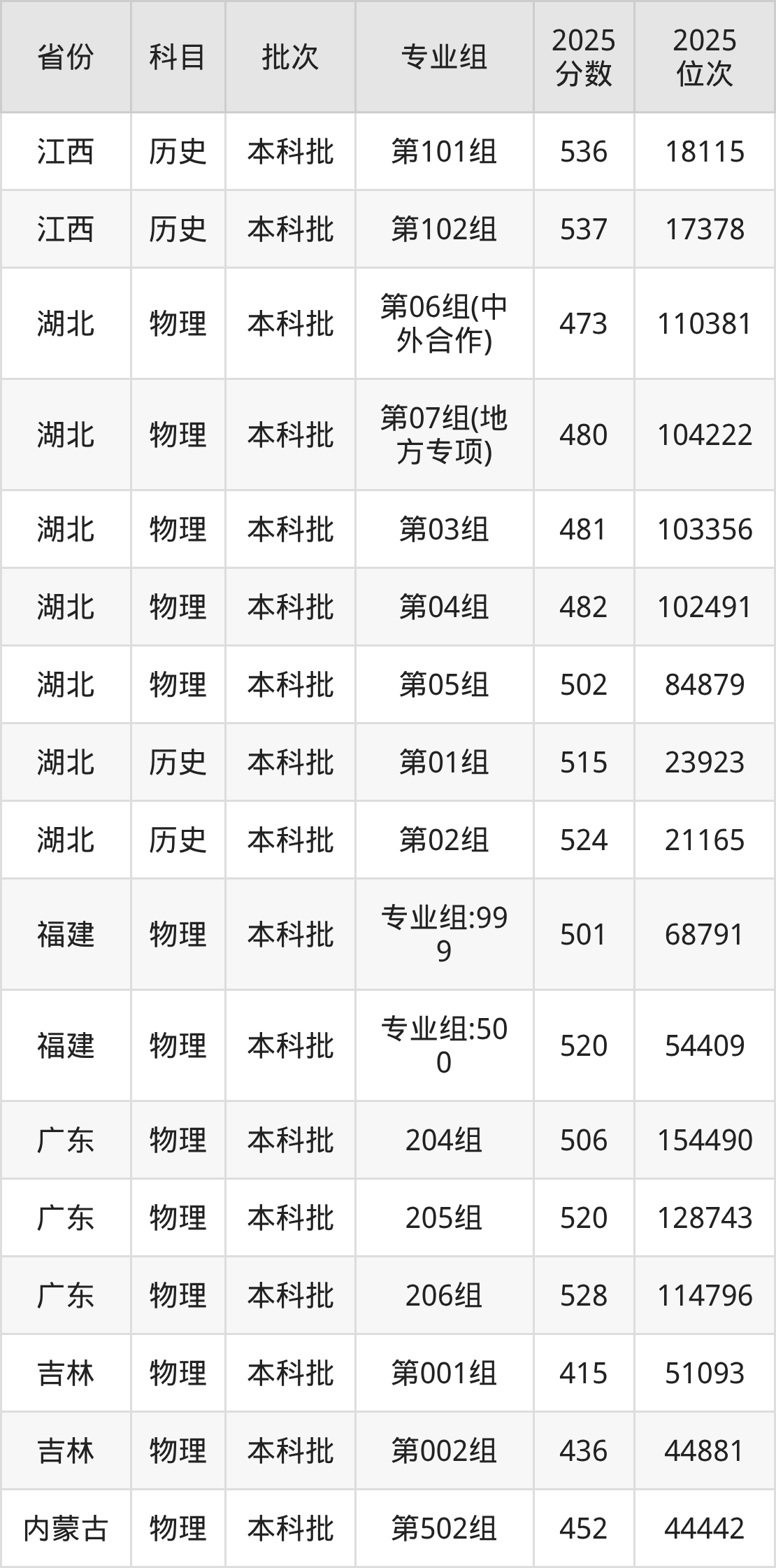 2025年在本科物理类进行招生,各专业组分数线详情如下: