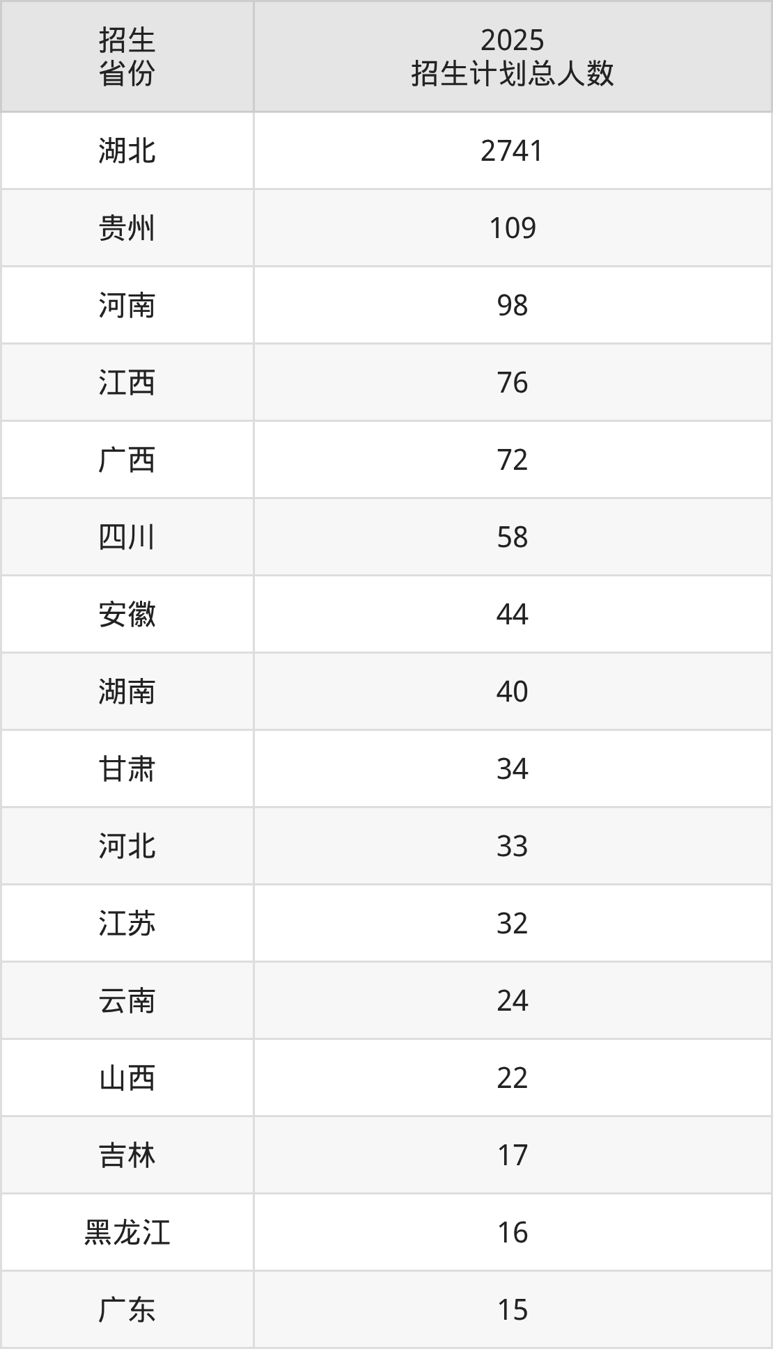 2025年湖北工程学院面向全国21个省市开展本科招生;招生专业共44个,招生人数共3472人。2025年在湖北省招生计划总人数是2741人,其中,湖北工程学院在湖北省招生人数最多的是机械设计制造及其自动化。湖北工程学院在各省具体招生人数情况如下表。