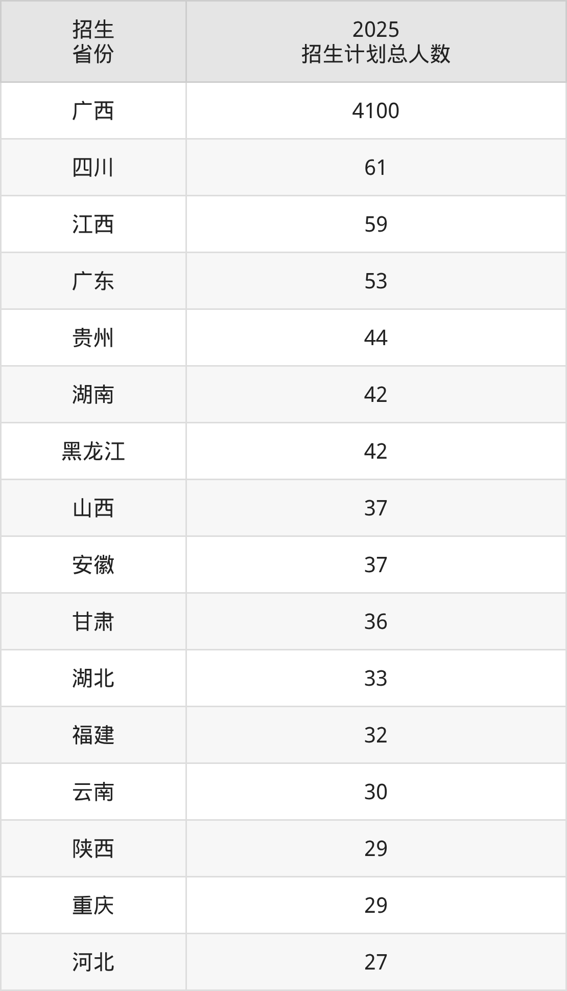 2025年南宁师范大学面向全国24个省市开展本科招生;招生专业共52个,招生人数共4842人。2025年在广西壮族自治区招生计划总人数是4100人,其中,南宁师范大学在广西壮族自治区招生人数最多的是思想政治教育。南宁师范大学在各省具体招生人数情况如下表。