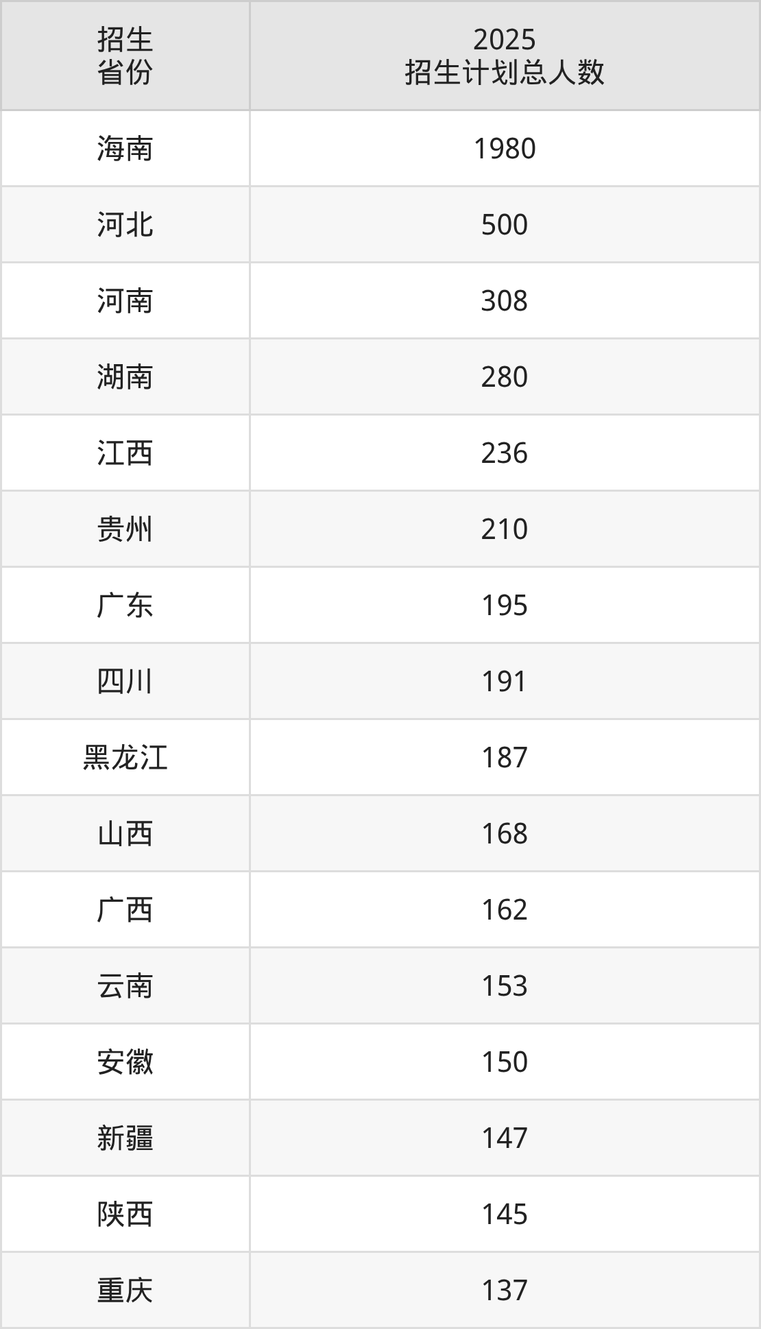 2025年海口经济学院面向全国27个省市开展本科招生;招生专业共34个,招生人数共2514人。2025年在海南省招生计划总人数是1980人,其中,海口经济学院在海南省招生人数最多的是网络新闻与传播。海口经济学院在各省具体招生人数情况如下表。