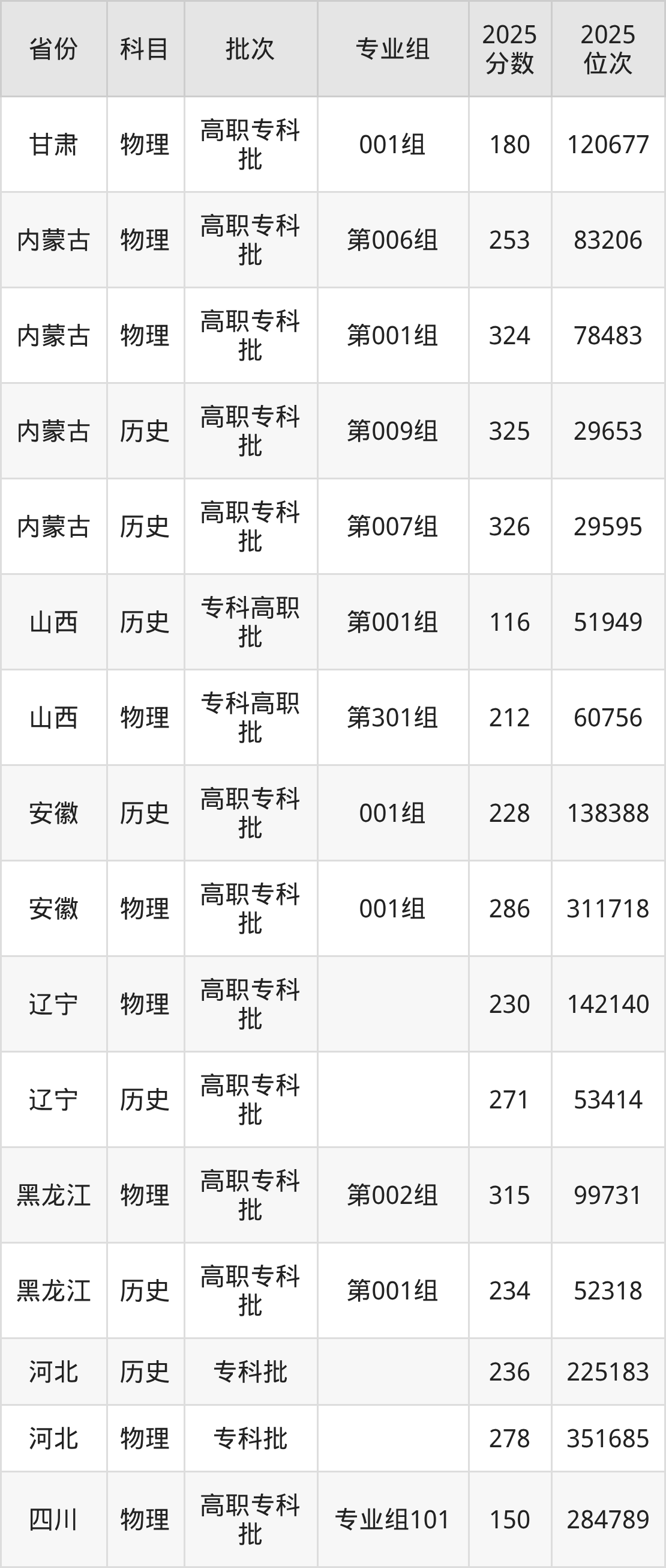 2025年在专科物理类进行招生,各专业组分数线详情如下: