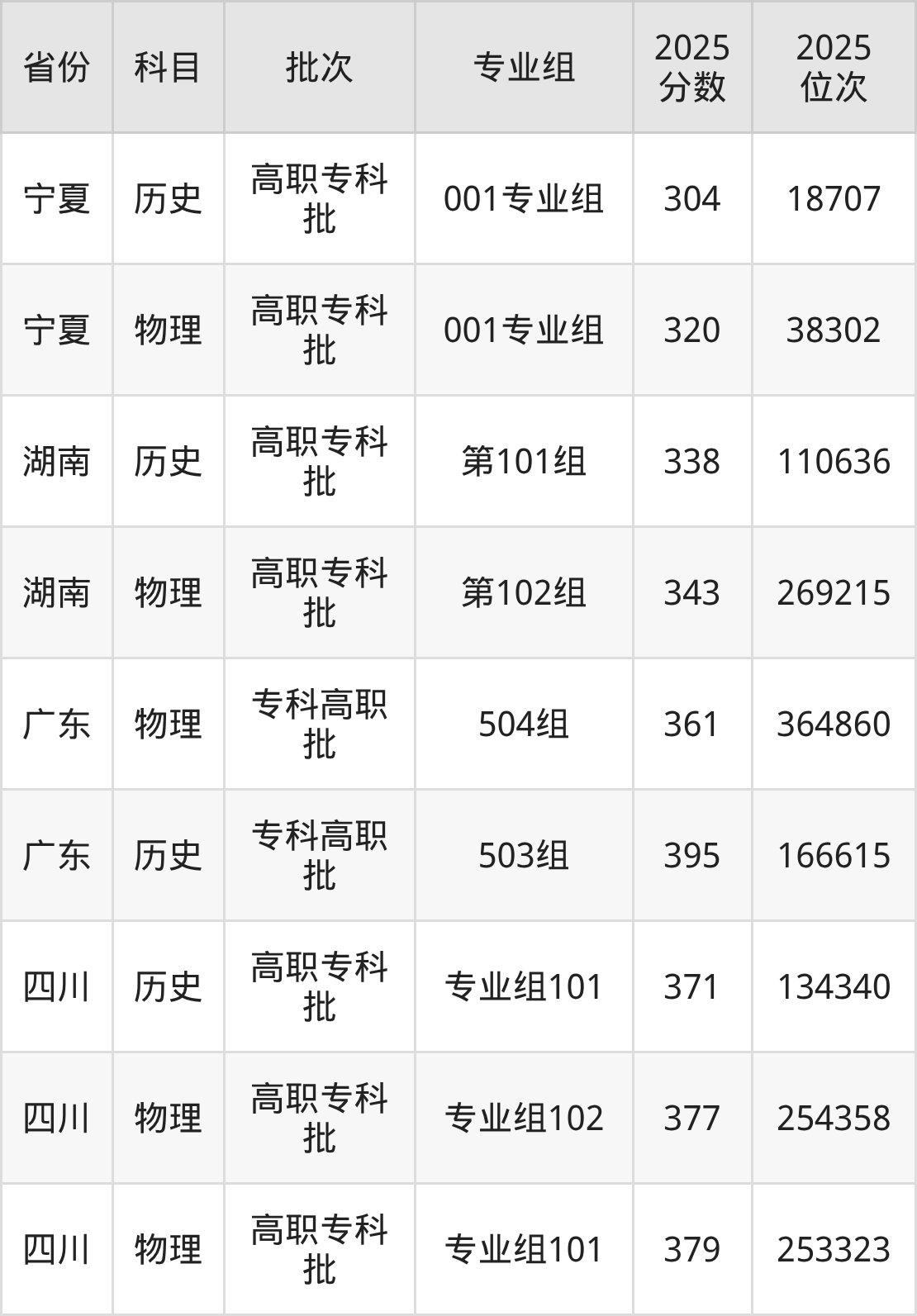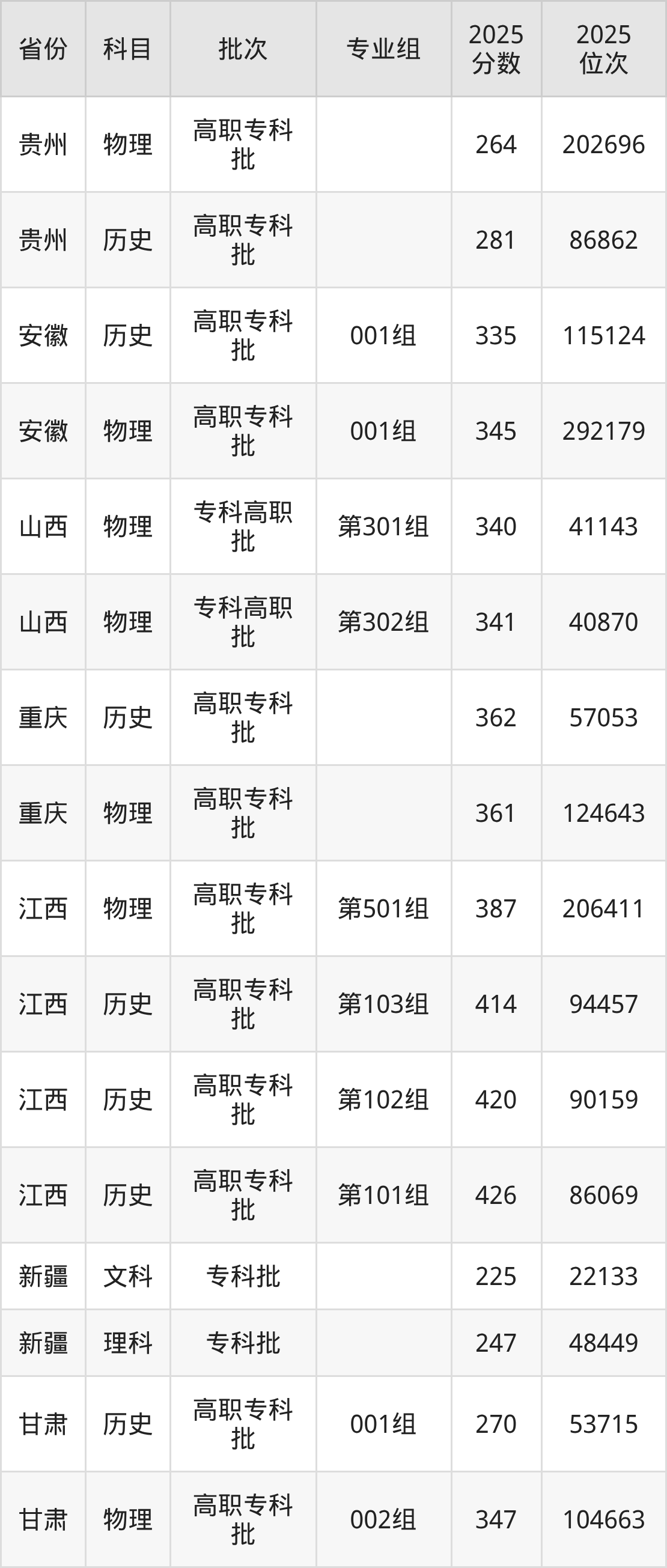 2025年在专科物理类进行招生,各专业组分数线详情如下: