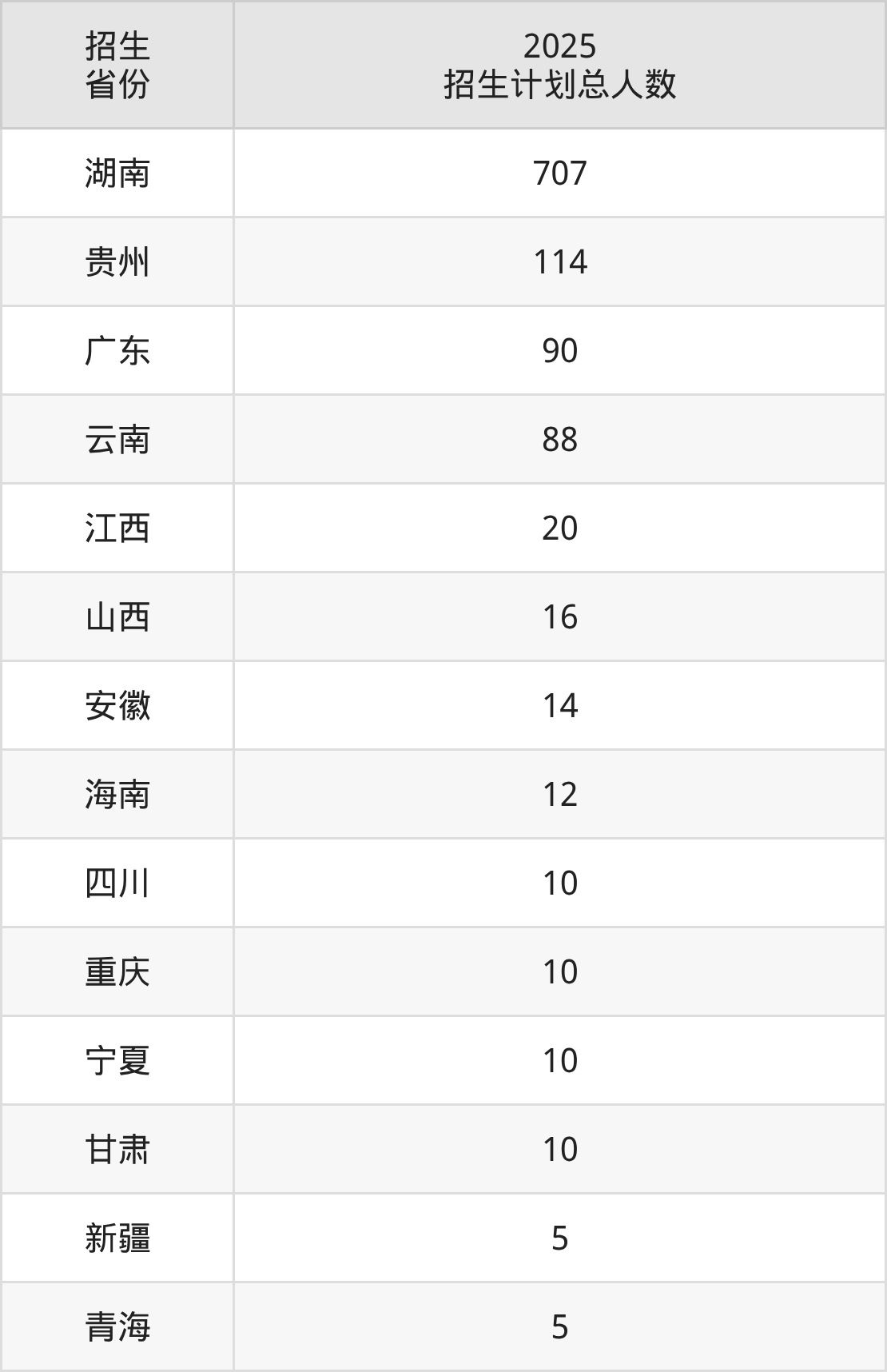 2025年湖南九嶷职业技术学院面向全国14个省市开展专科招生;招生专业共14个,招生人数共1111人。2025年在湖南省招生计划总人数是707人,其中,湖南九嶷职业技术学院在湖南省招生人数最多的是机电一体化技术。湖南九嶷职业技术学院在各省具体招生人数情况如下表。
