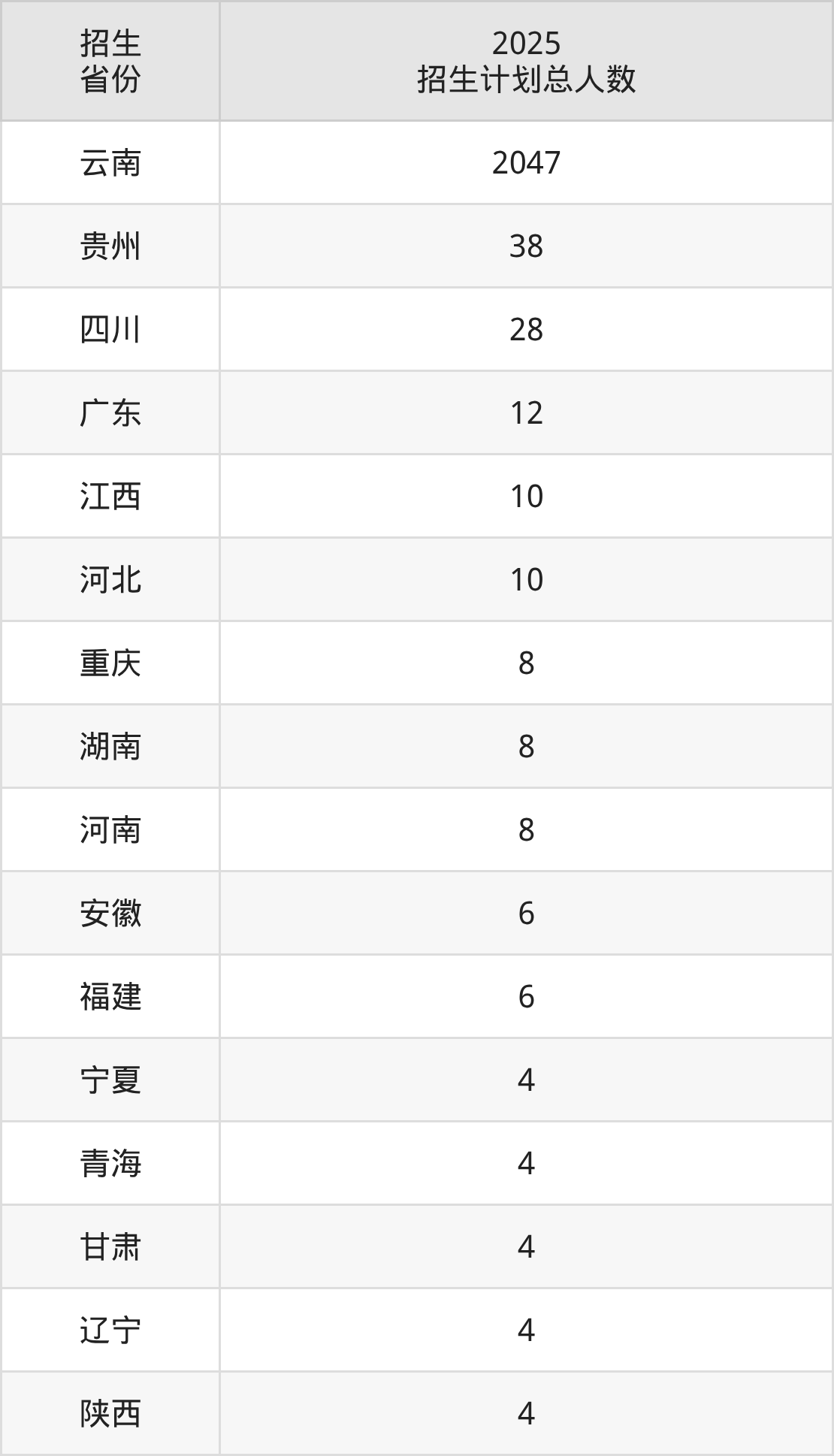 2025年云南林业职业技术学院面向全国17个省市开展专科招生;招生专业共45个,招生人数共2205人。2025年在云南省招生计划总人数是2047人,其中,云南林业职业技术学院在云南省招生人数最多的是林业技术。云南林业职业技术学院在各省具体招生人数情况如下表。