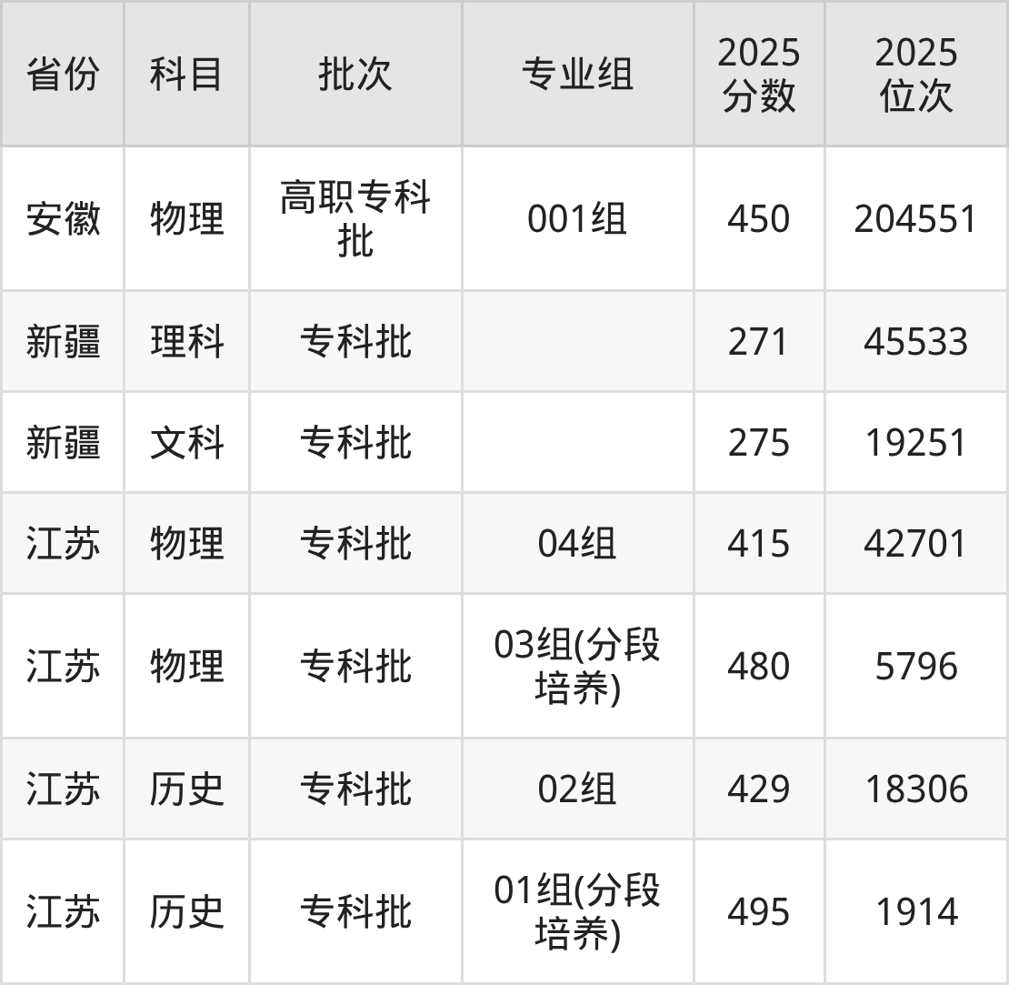 2025年无锡科技职业学院全国录取分数线是271分到495分,录取最低在新疆理科、录取最高在江苏历史类(01组(分段培养))。各省各专业组最低分具有差异,详情如下: