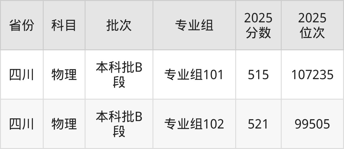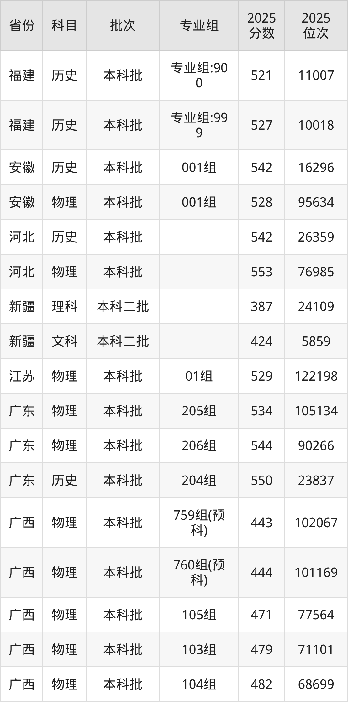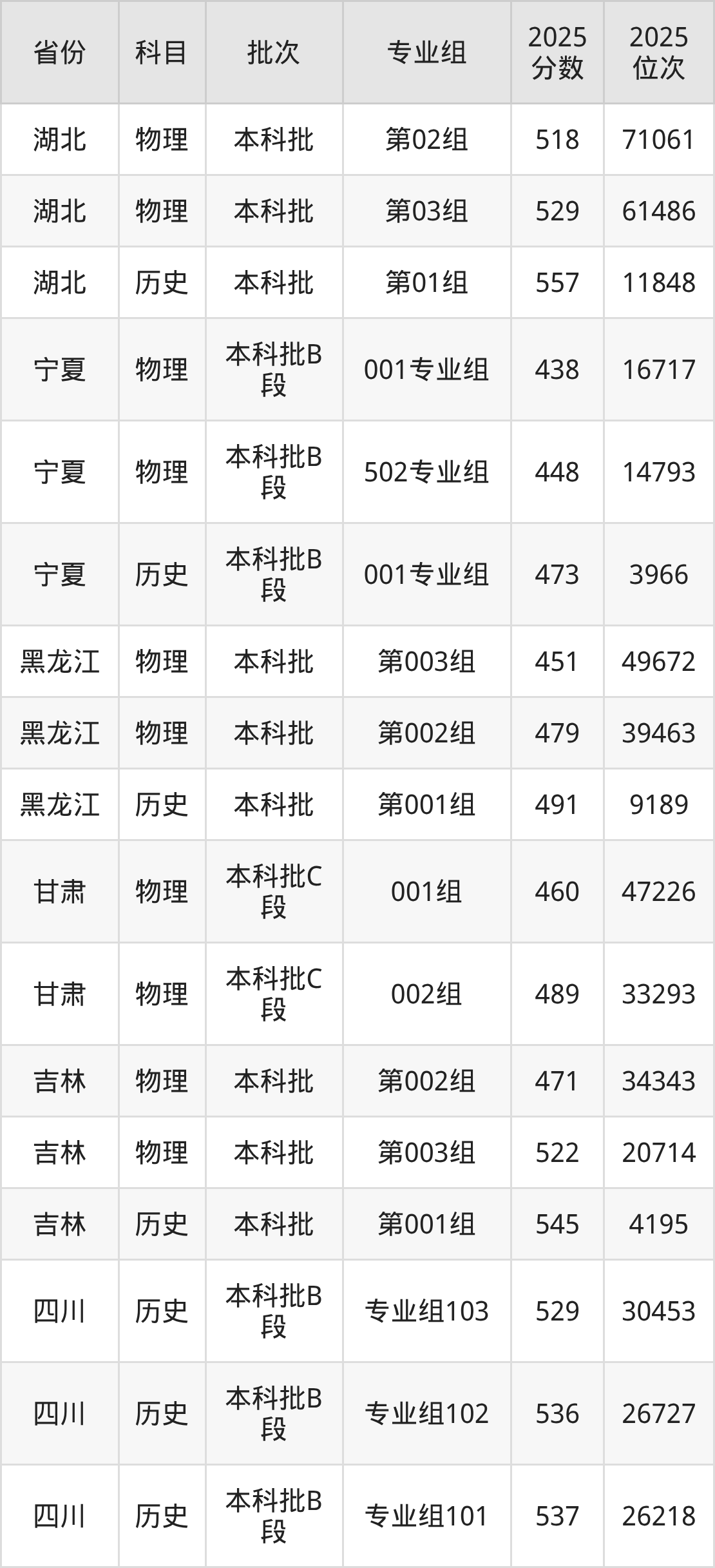 2025年在本科物理类进行招生,各专业组分数线详情如下: