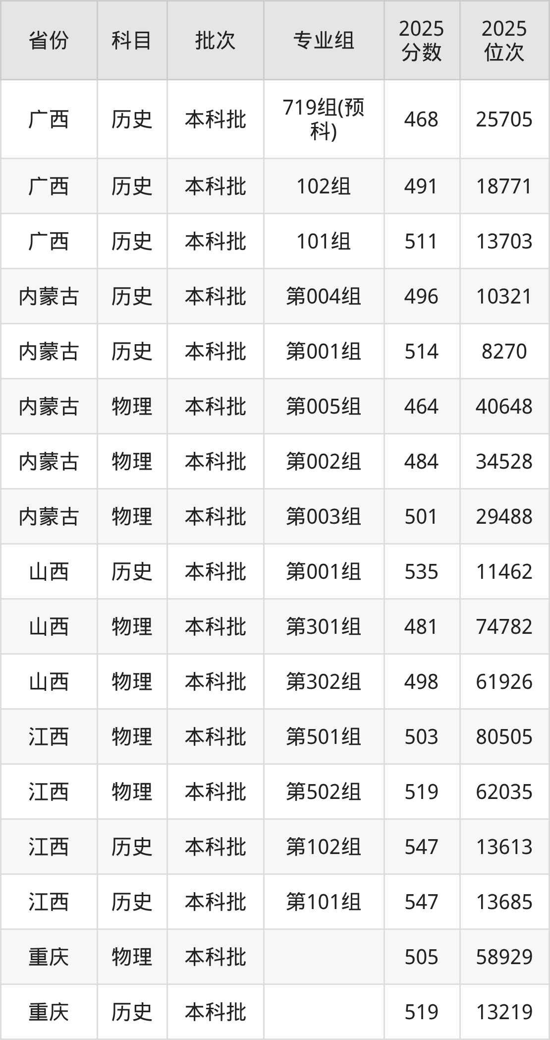 2025年投档录取最低分为505分,录取最低位次为58929名。