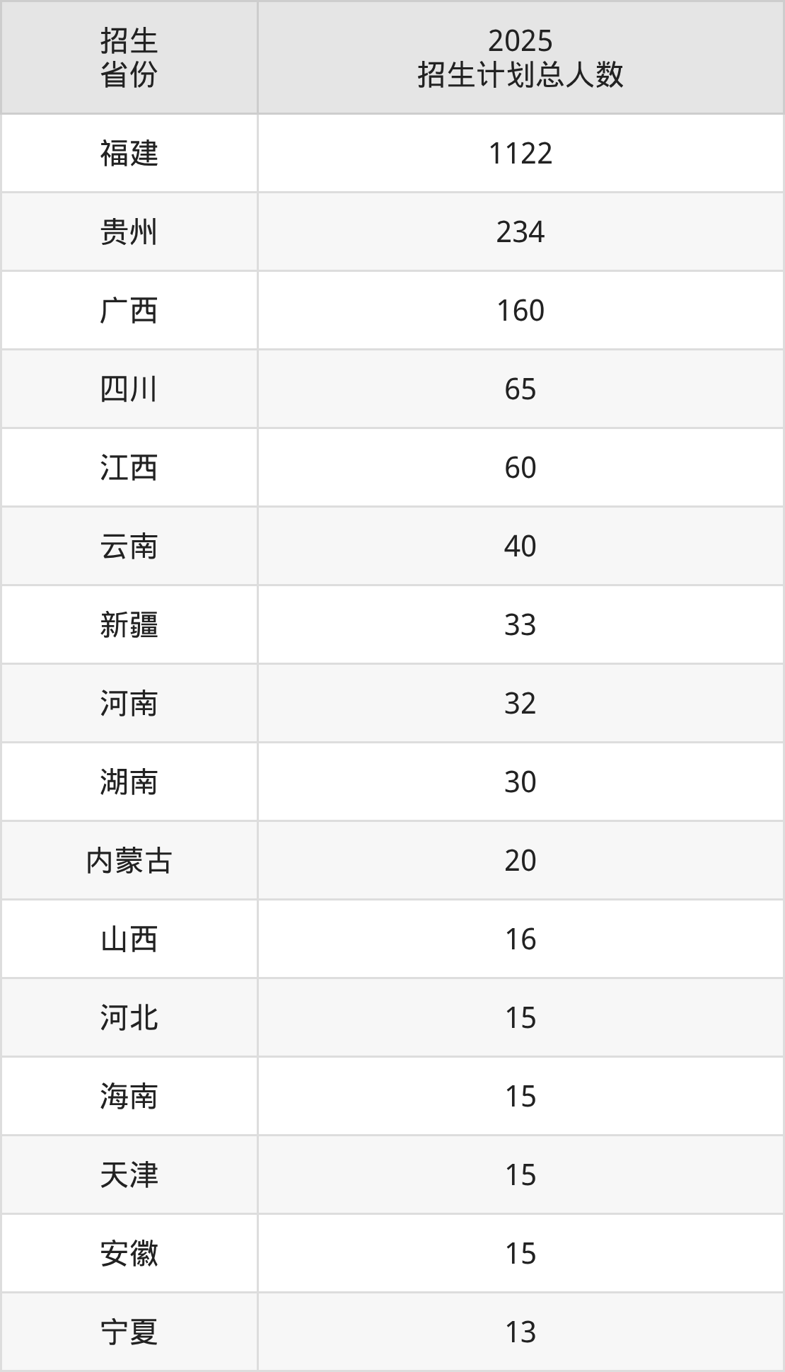 2025年闽江学院面向全国26个省市开展本科招生;招生专业共39个,招生人数共1959人。2025年在福建省招生计划总人数是1122人,其中,闽江学院在福建省招生人数最多的是计算机科学与技术。闽江学院在各省具体招生人数情况如下表。