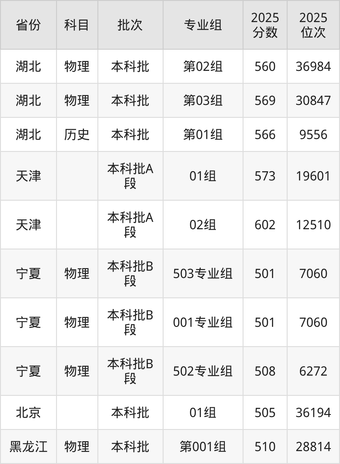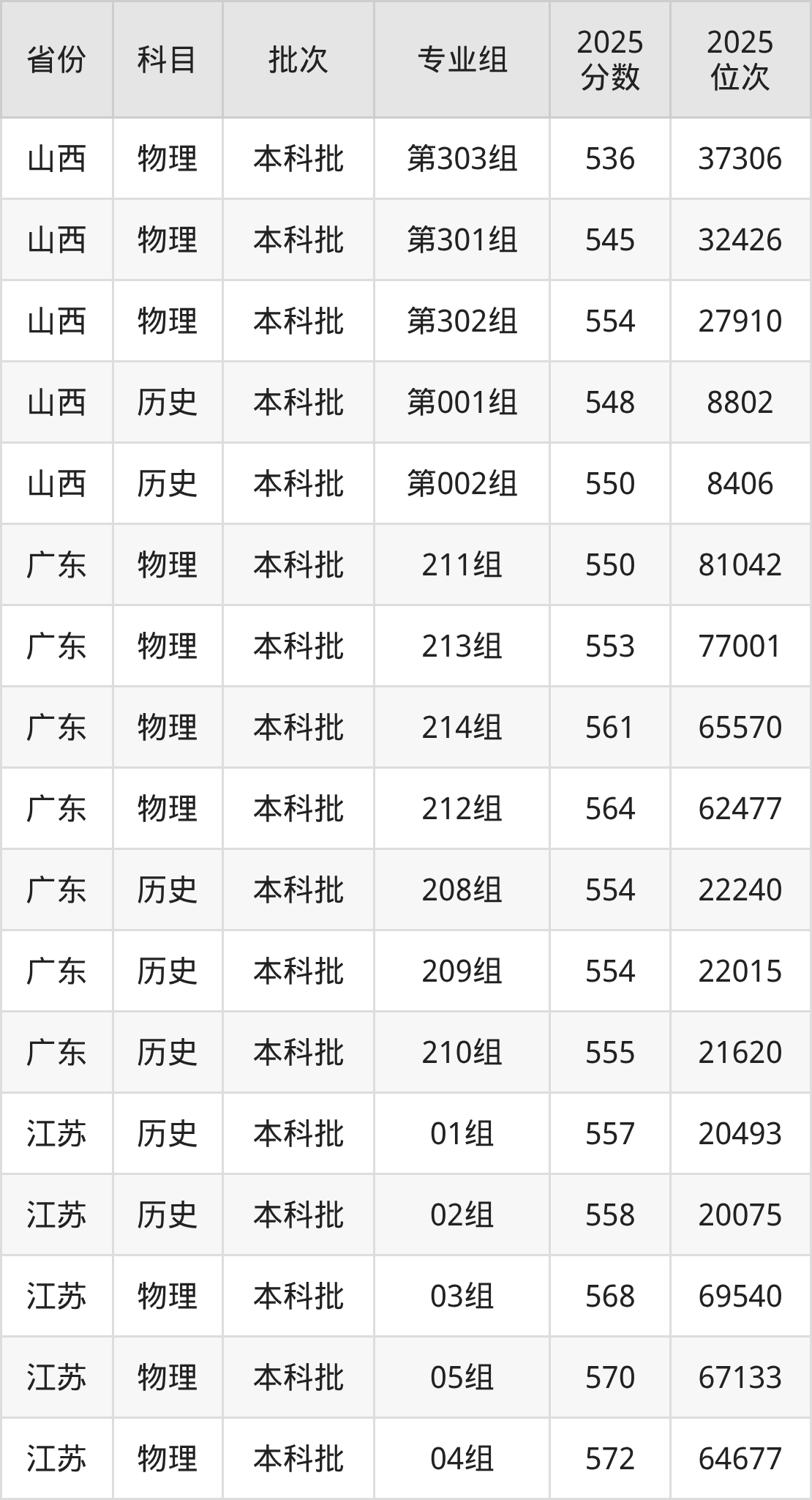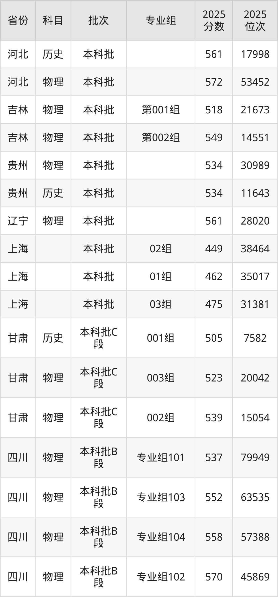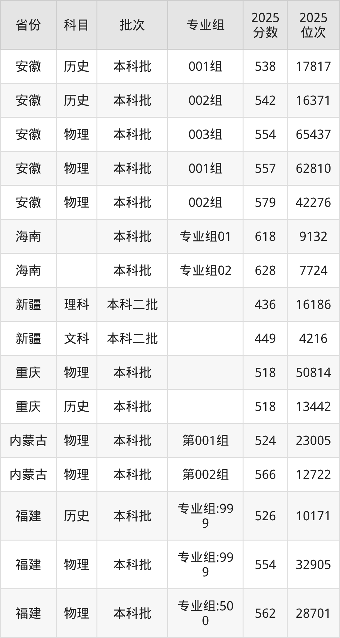 2025年在本科物理类进行招生,各专业组分数线详情如下: